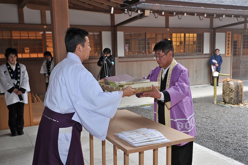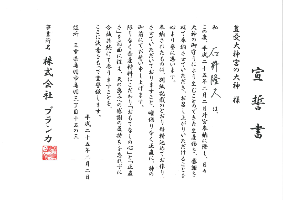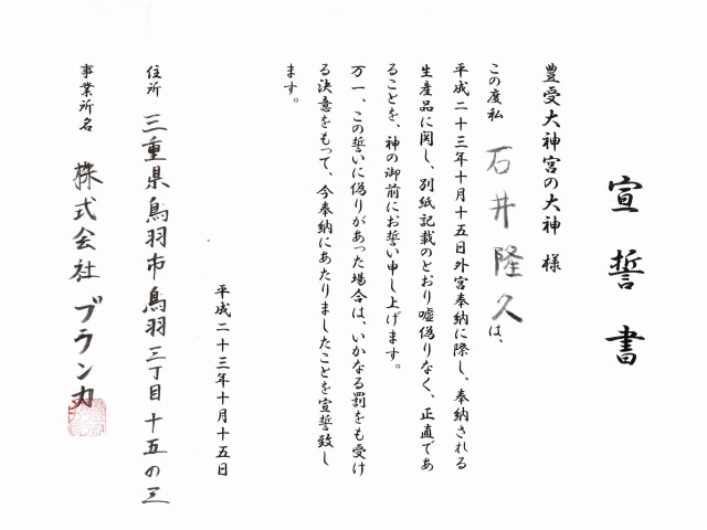 遷宮の年ですので、商売繁盛を願い奉納させて頂きました。大変厳粛に行われ、気の引き締まる思いでした。神楽・御垣内参拝も大変良かったです。奉納後に、神戸店でシールを使用したところ、お客様に大変よろこんでもらいました。
