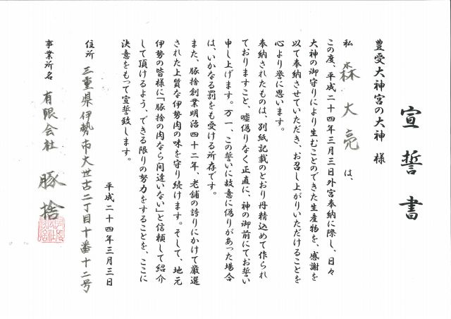 名産伊勢肉の名に恥じない牛を育て、販売し、伊勢に「豚捨あり」と地元の方々が誇れるように生産、販売してまいります。