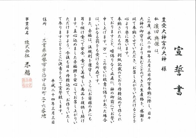 当社は、法規則を遵守し、さらにお客様の声にも耳を傾け「食べて安全、食べて美味しい商品」を提供し続けます。真心込めた赤福餅をお客様に安心してお召し上がりいただけますよう、今後も日々丹精込めて、お作りいたして参ります。
