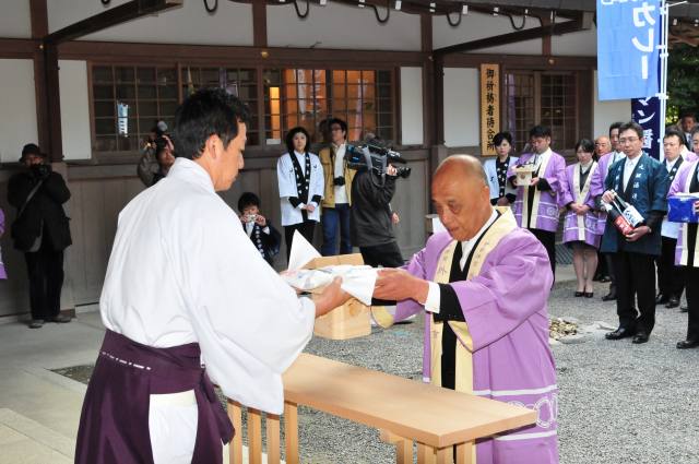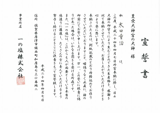 奉納するときは、緊張しました。佐賀県から参加させて頂きましたが、商工会議所さんから声をかけていただいたおかげで、思わぬ名誉になったと思っております。佐賀県の代表として宣誓書を読み上げさせていただきましたが、その通り正直にまじめな商品を作っていかなければならないと思いました。