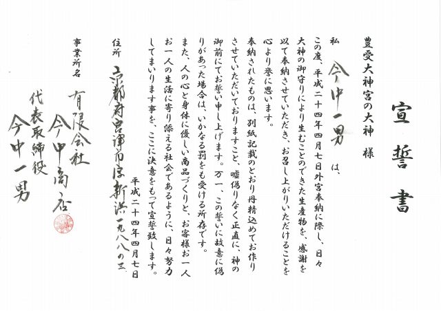 元伊勢とも言われる、京都の宮津市から奉納させていただきました。今回は、宮津商工会議所として、私たちの地域の特産品を代行奉納させていただきました。宣誓書の言葉一つ一つのように、本当に商売人の1番の原点に戻り、背筋が伸びる思いでした。そういった心を忘れないことが、商人(あきんど)の道だろうなと会議所の職員としても思います。外宮奉納市では、おかげさまで結構反応もいただいて、非常にありがたかったです。もう少し持って来ればよかったと思いました。【代行奉納:宮津商工会議所】