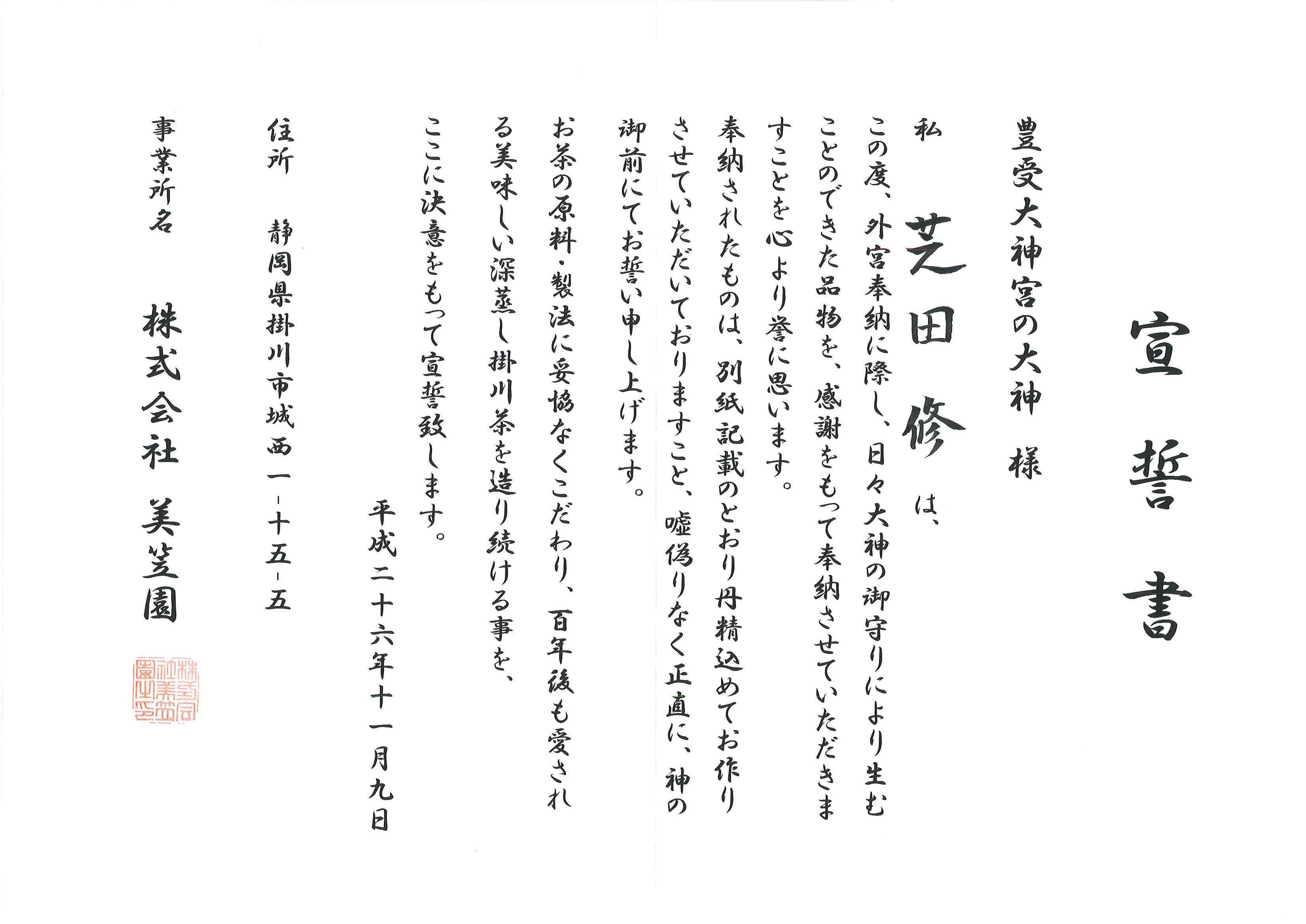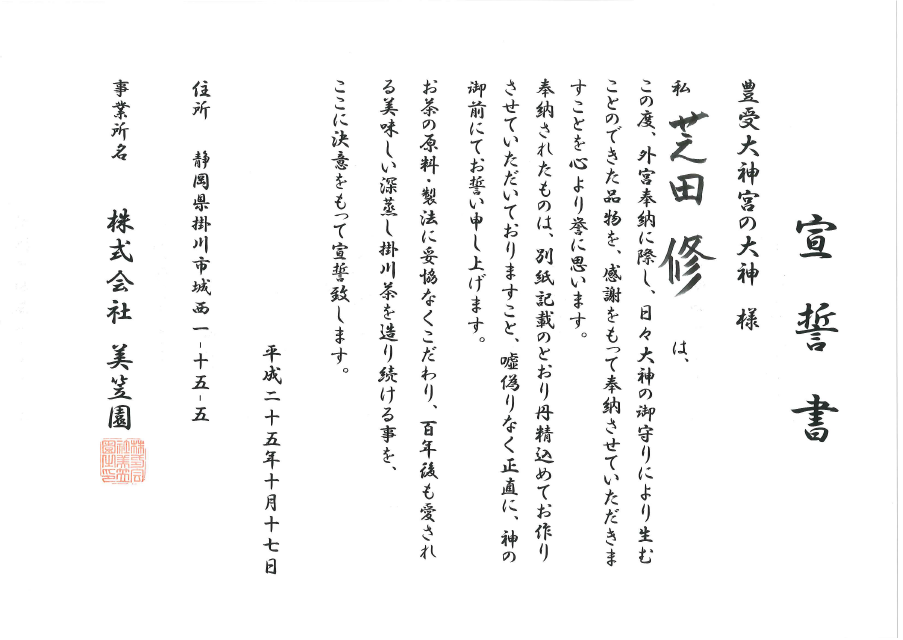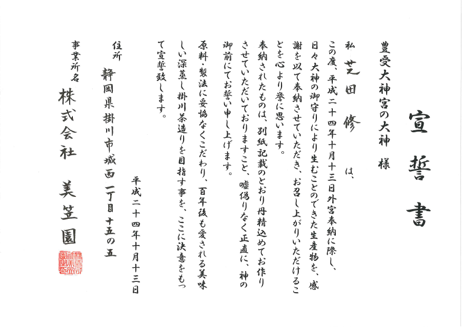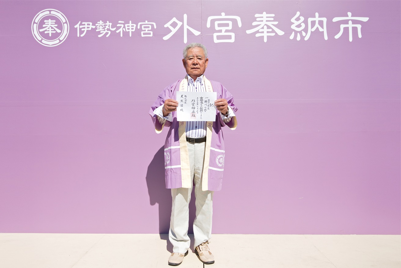 奉納は2回目になります。正直なお茶作りを奉納という形で改めて宣誓したかったので、参加しました。お茶を作る事が出来るありがたさを実感することができました。すばらしい神楽殿・御垣内へ参拝できてありがたく思います。社員に正直なもの作りの徹底をすることができ、百年後もかわらない正直なもの作りをしていきます。