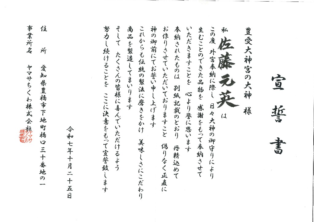 伝統食の製造者として食を司る豊受大神をお祀りする外宮に奉納できる事は大変名誉な事だと存じます。一般では入れない場所への参拝はありがたいです。社員一同、心も新たにより一層精進したいと思います。早朝は少々厳しかったですが、清々しい思いで奉納出来ました。今後ともよろしくお願い申し上げます。