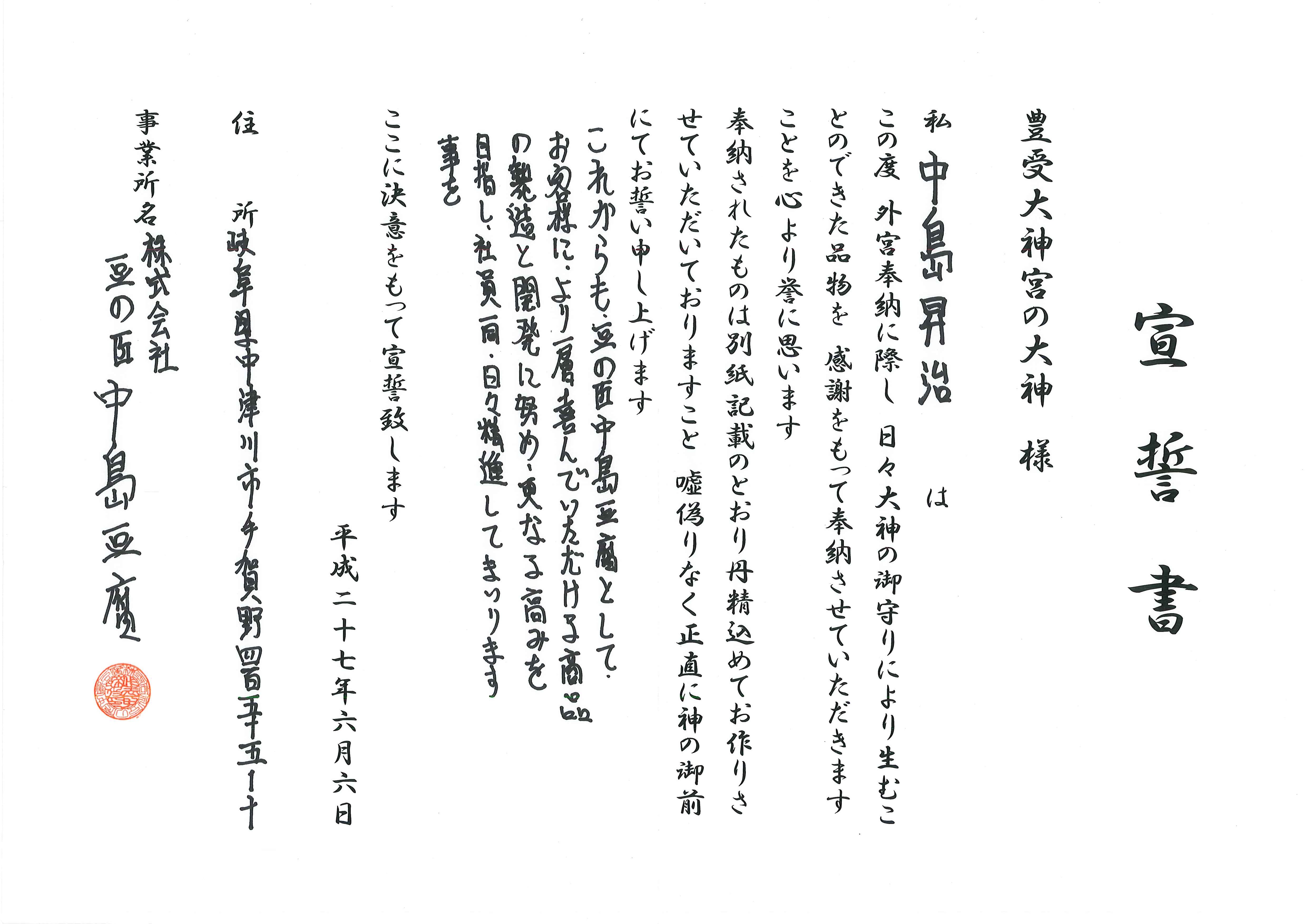 以前に奉納された岩戸の塩の「岩戸館」さんから、ご紹介いただいたのがきっかけで参加させて頂きました。奉納させていただき、大変有難く思いました。お神楽・御垣内参拝もとてもよかったです。奉納を経て、お客様からの反応も増えて、自身のものづくりとしても有意義なものとなりました。一度ではなく、これから毎年参加させて頂きたいと思います。