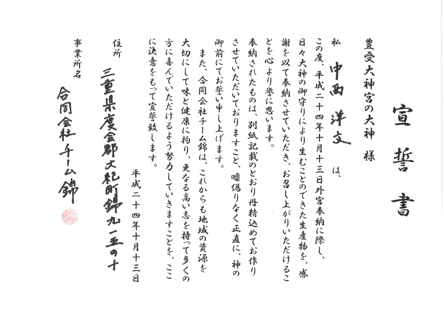 県のフードイノベーション課にプロジェクトを紹介されたことが、参加のきっかけになりました。奉納して感じたことは、自然の恵み、人の思いやりに感謝する心を持つことの大切さです。お神楽と御垣内参拝に参列した際は、日常を離れ、仕事の原点を思い出すことができました。奉納後は、本物を創ることへのこだわりをつよくしました。この外宮奉納はぜひ継続して頂きたいと思います。(シールの取り扱いについてのルールを明確にして頂ければと思います。)