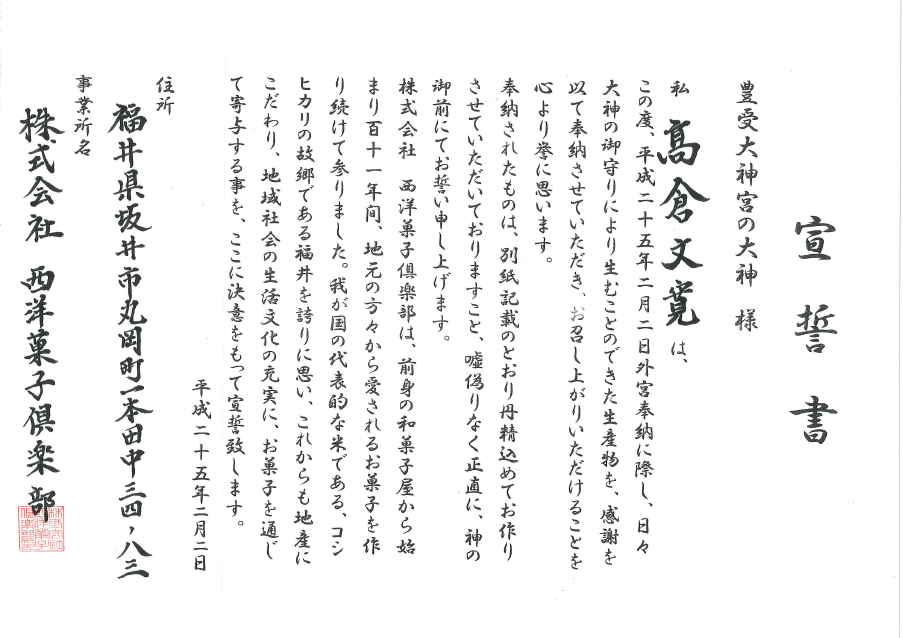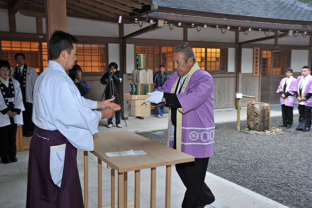 三重県菓子協会会長のご推薦を受けて奉納に参加致しました。嘘・偽りのない物作りをお誓いできました事に感謝致します。神楽・御垣内参拝も、非常に素晴らしい経験をさせて頂きました。奉納後は、各マスコミからの取材が殺到しております。介護施設等より、奉納品の注文多数ありました。外宮奉納を広く広報して頂きくことを期待しております。