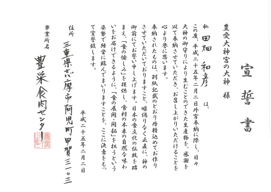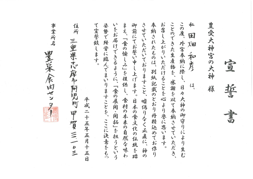 他の業者さんの木札を見て、商工会にたずね、今回の参加に至りました。緊張感に包まれ、「無」の世界を感じました。私達は神様から大地に贈られたものを無駄なく大切にするということを、もう1度改めて考えなければという気持ちになりました。「食」にこだわり、「まごころ」のおもてなしで、より一層良いものをお届けし、お客様に「おいしかった、また食べたい」と言っていただけるよう努めていきたいと思います。今後は、奉納市出店者数が増えて、最大級の伊勢のイベントの1つになるといいと思っています。これをきっかけに、三重県の盛り上がりを期待しています。
