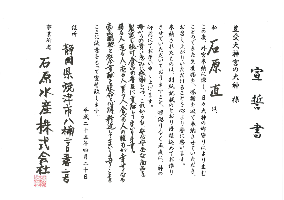 「海が好き、魚が好き、健康はもっと好き」を企業スローガンに、焼津港水揚げの魚を安心・安全に全国へお届けしています。「かつおたたき」「ツナピコ」「チーズかつお」に続く商品を奉納しました。