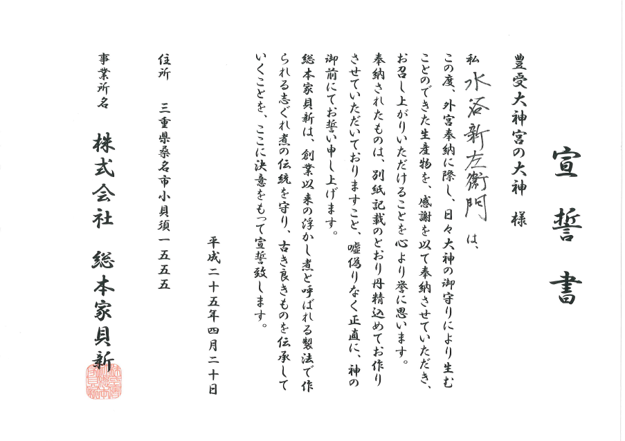 取引先に奉納のことを教えていただきました。日本の良き伝統の中で家業を通じて社会に奉仕する責任を改めて感じました。神楽・御垣内参拝も、初めての経験で感動しました。今まで以上に食に対する責任の重さを感じます。今後も、このような事業を末永くつづけていただきたいと思います。