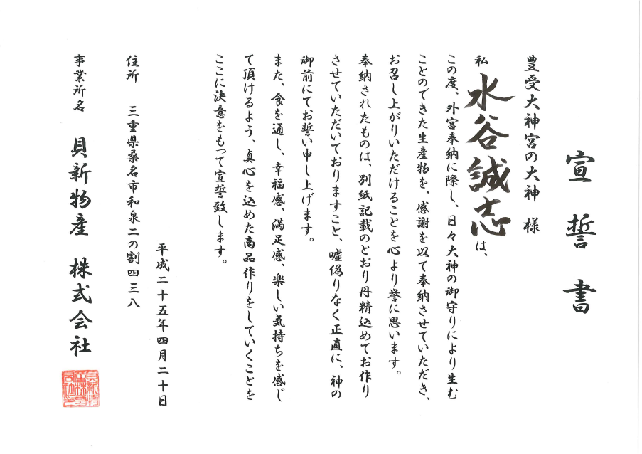 関連会社(総本家新之助貝新)の奉納を見て、今回参加しました。自社商品を通し、社会貢献することを改めて決意しました。神楽・御垣内参拝等も、貴重な体験をさせていただき、奉納後は社員に一体感が生まれた気がします。今後は、奉納した輪(和)を全国に広げて行き、奉納した会社商品すべてをまとめた大イベントを賑やかに開催してほしいです。