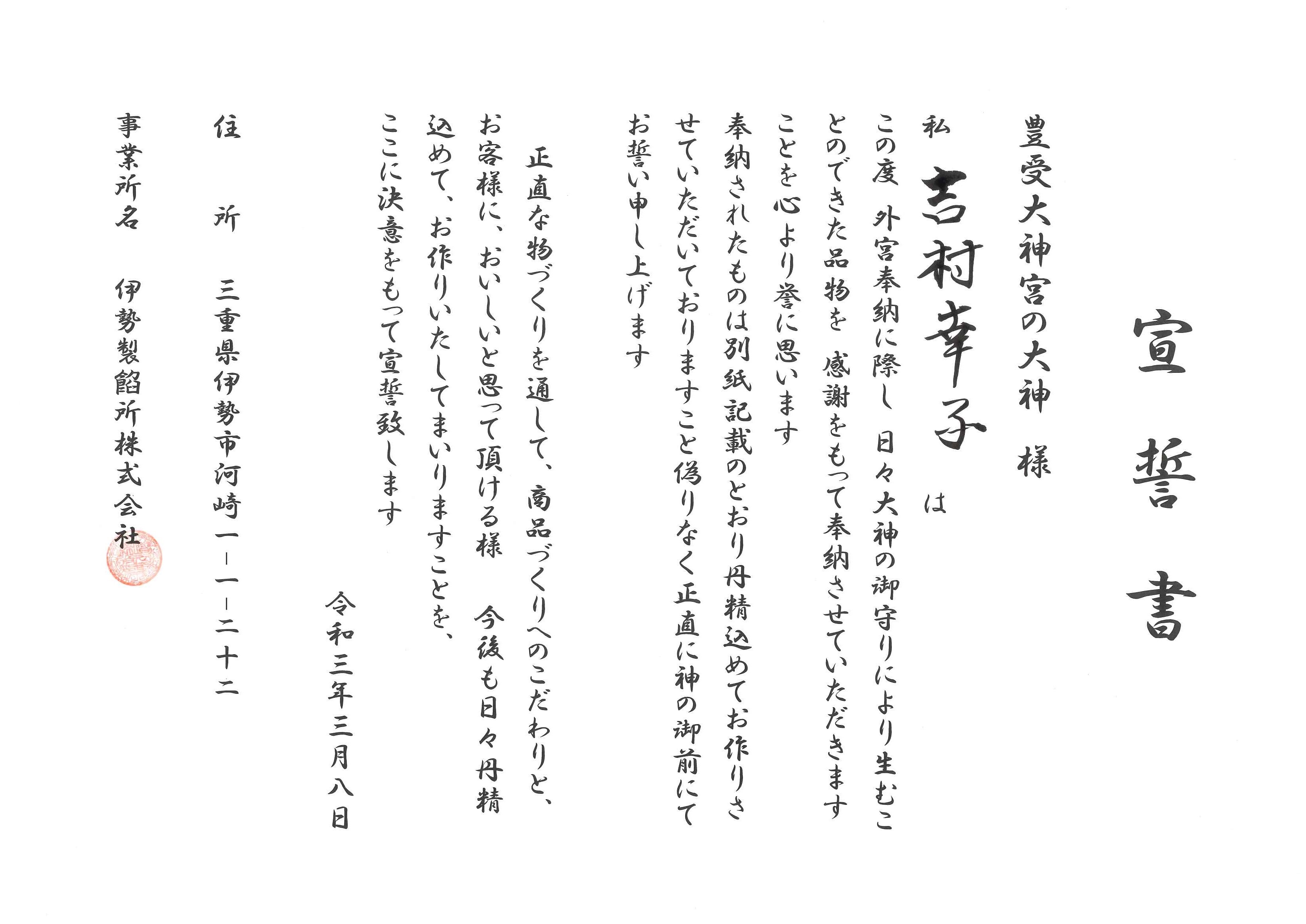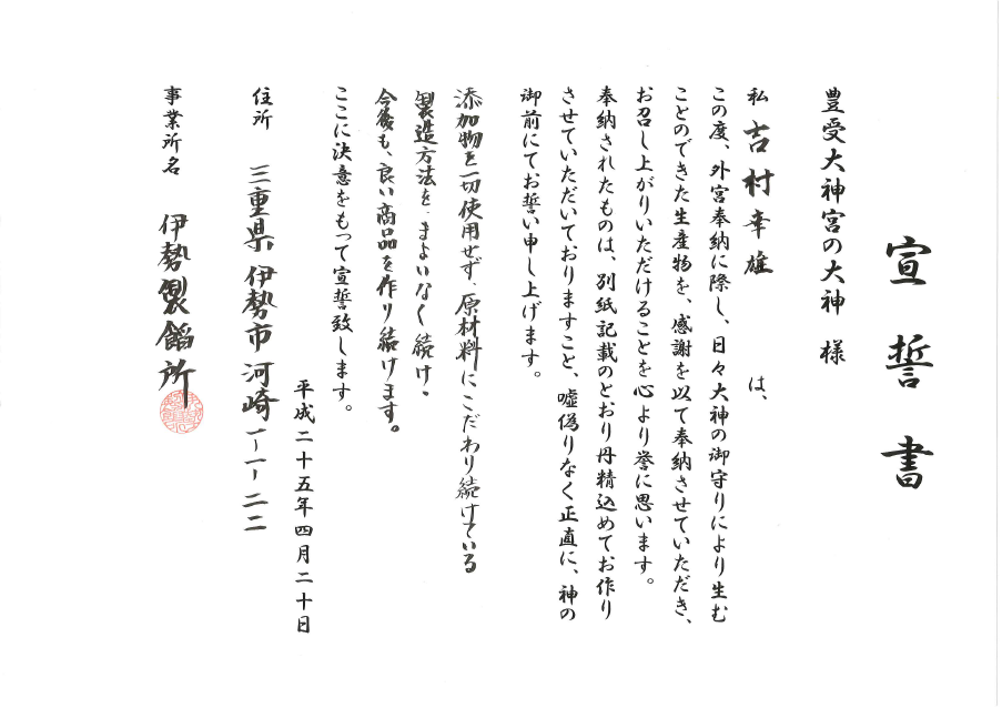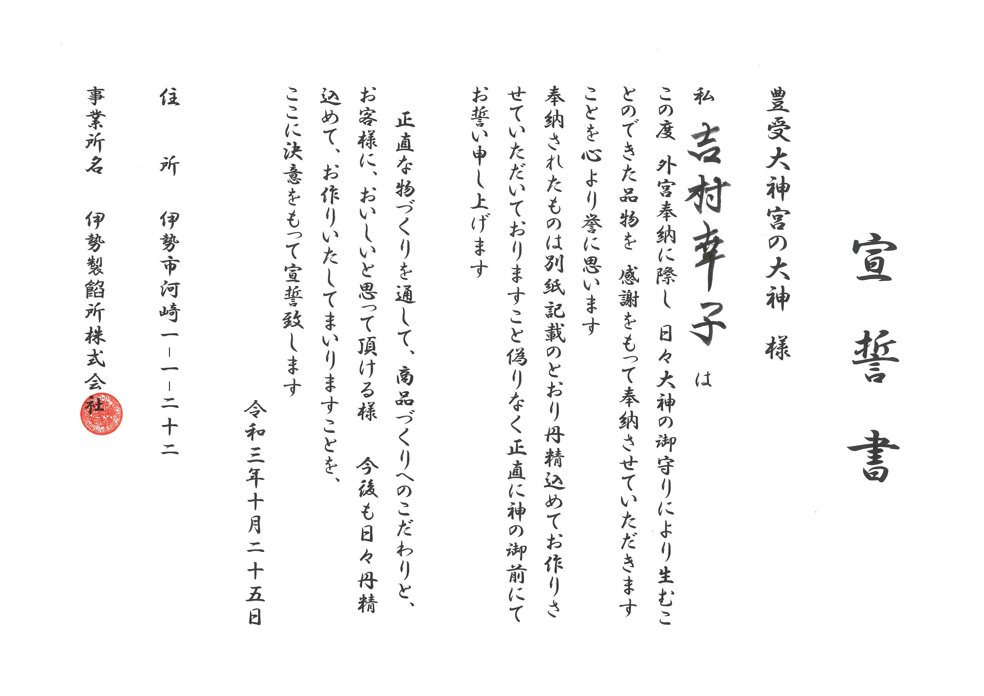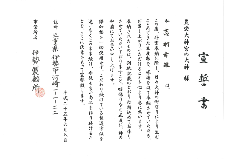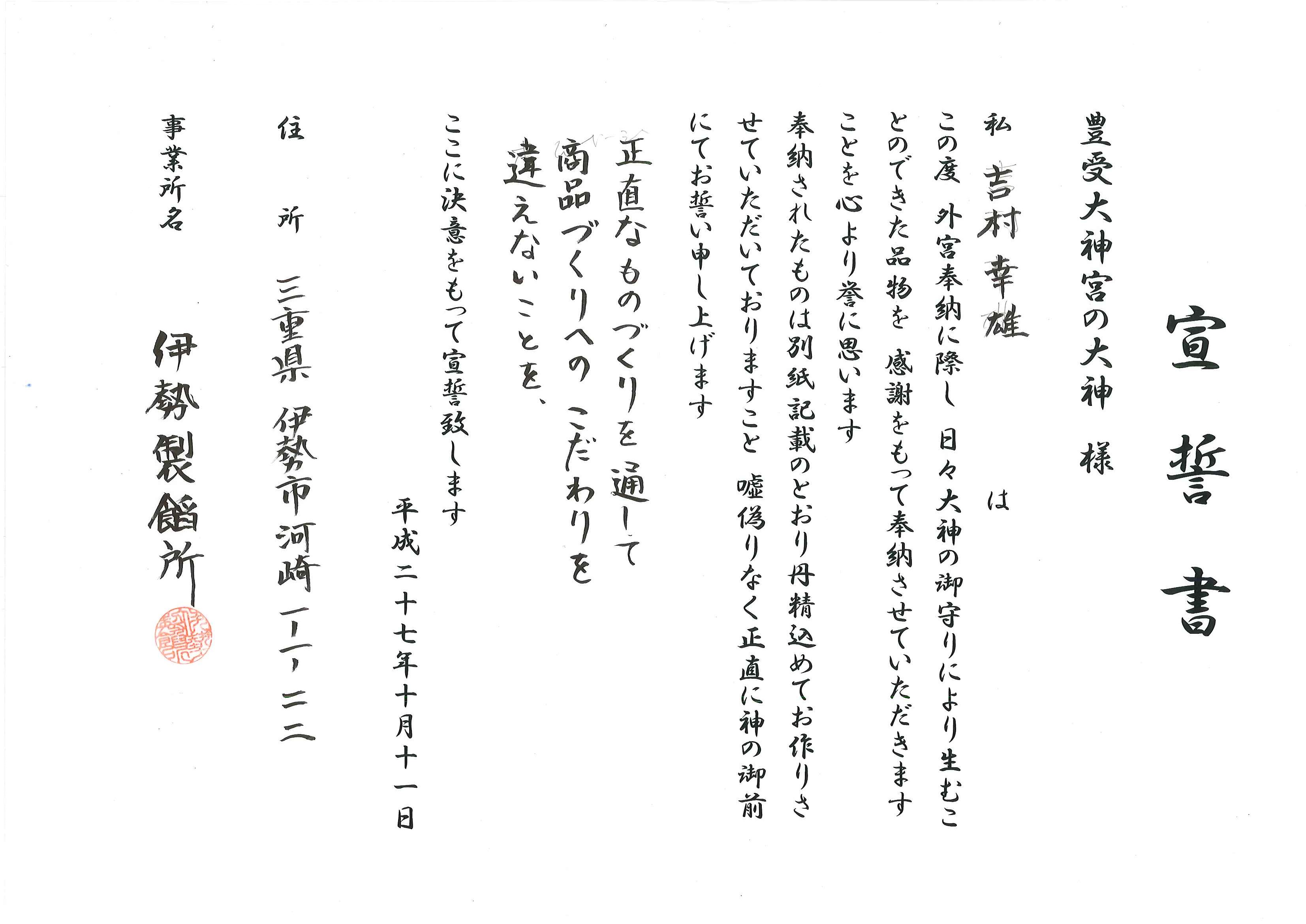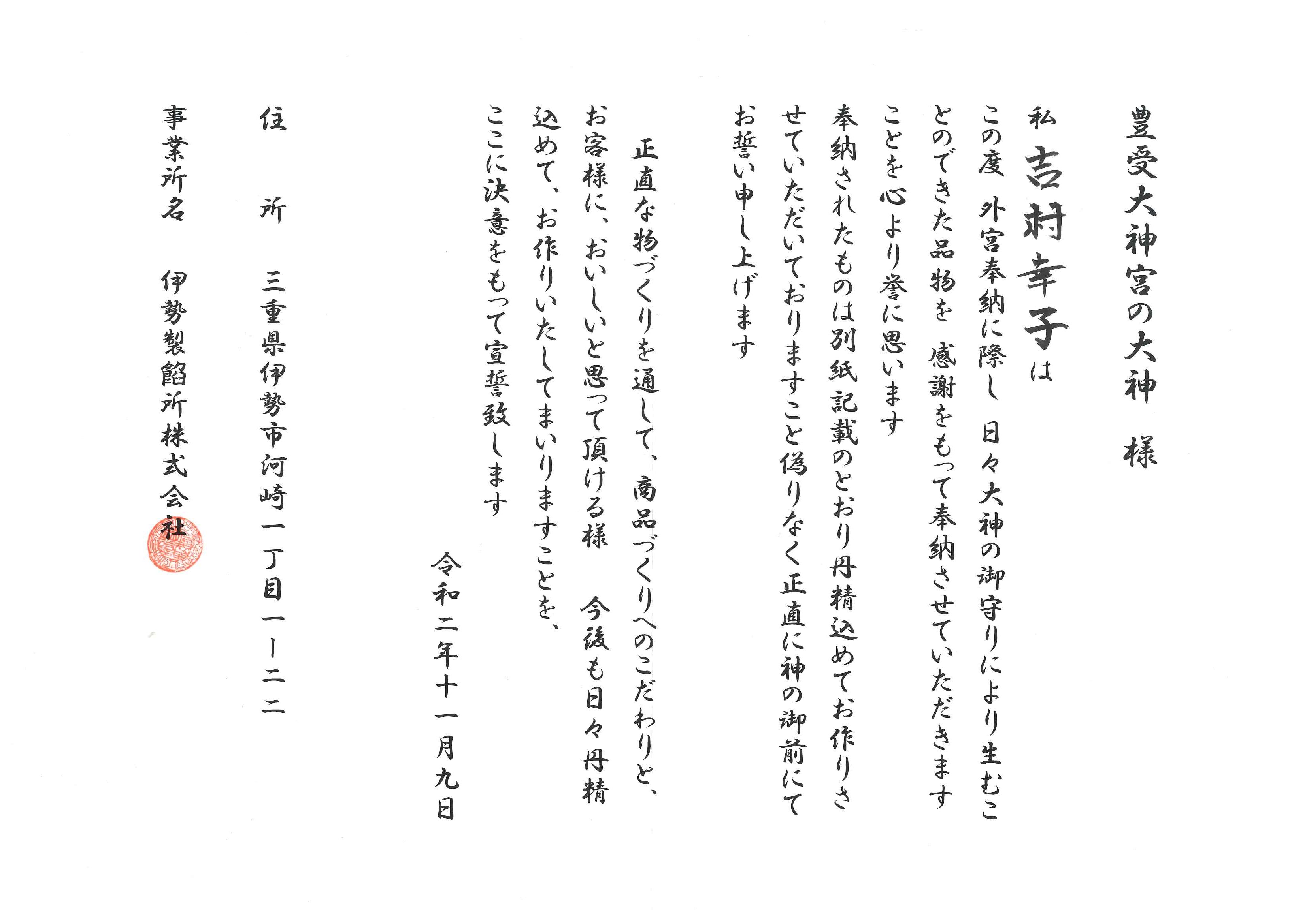 20年に一度の遷宮を迎える年に、食に神様に感謝したく奉納し、より安心・安全な商品を作っていきたいと奉納しました。奉納を機に、伊勢を全国発信していきたいです。