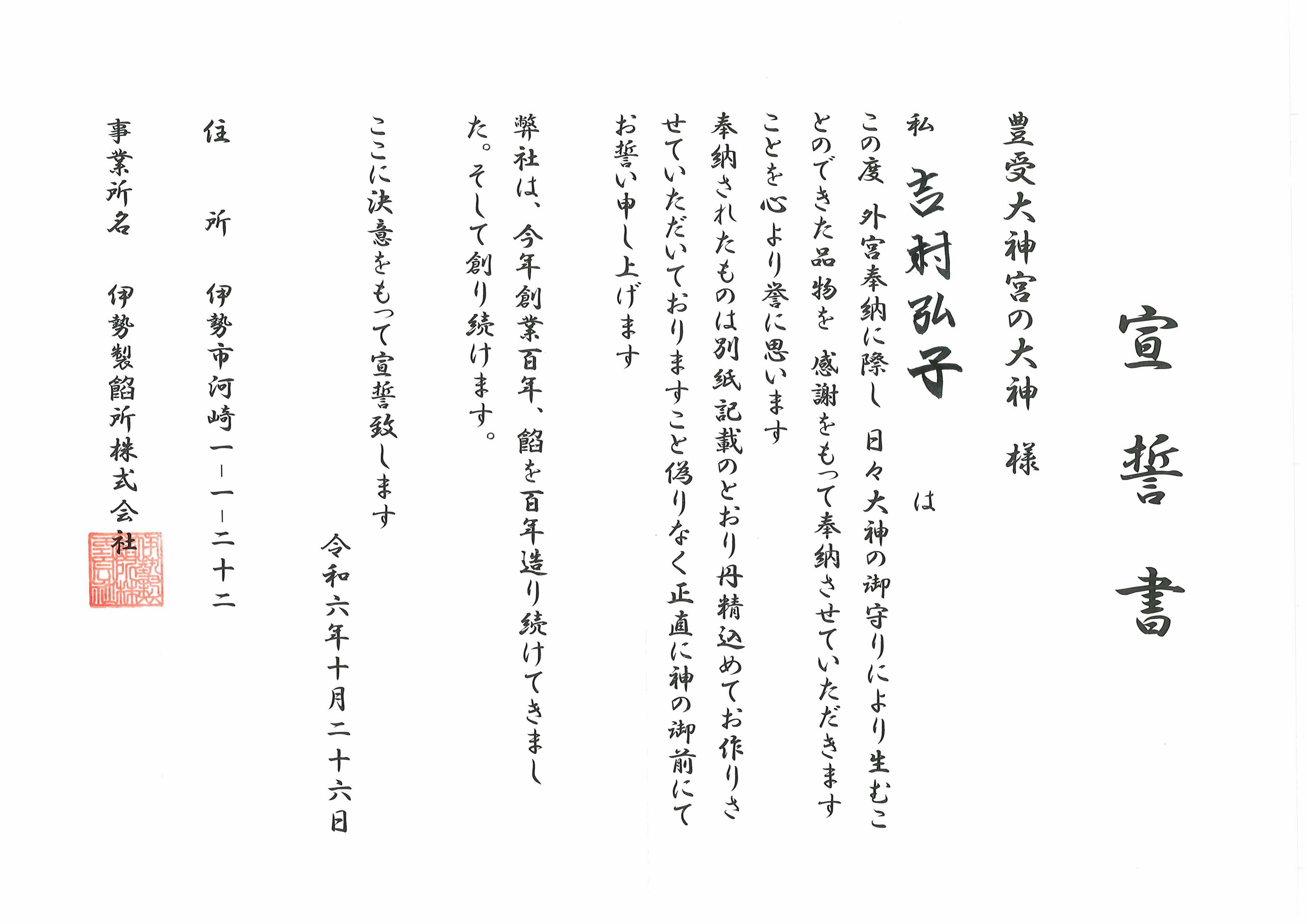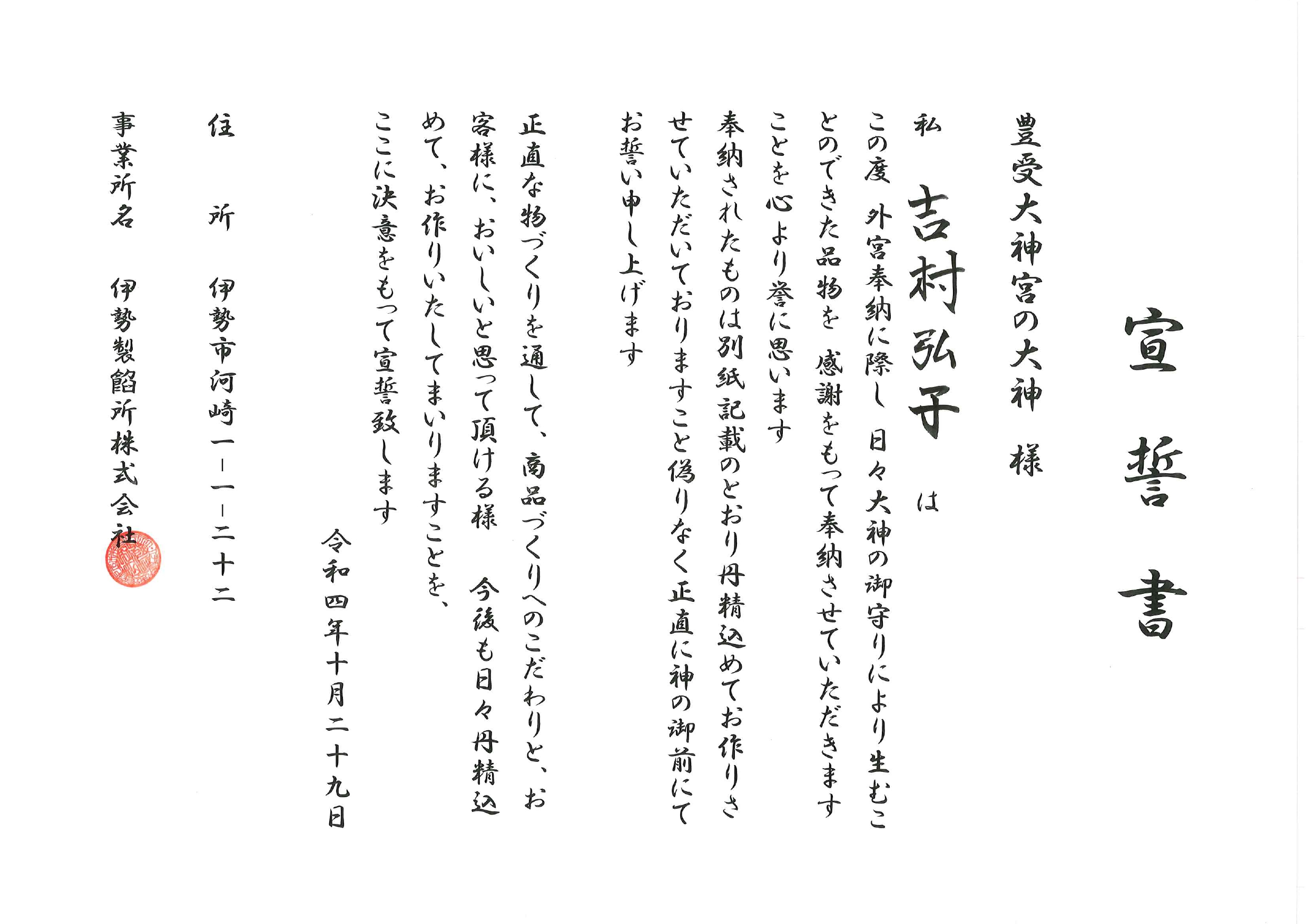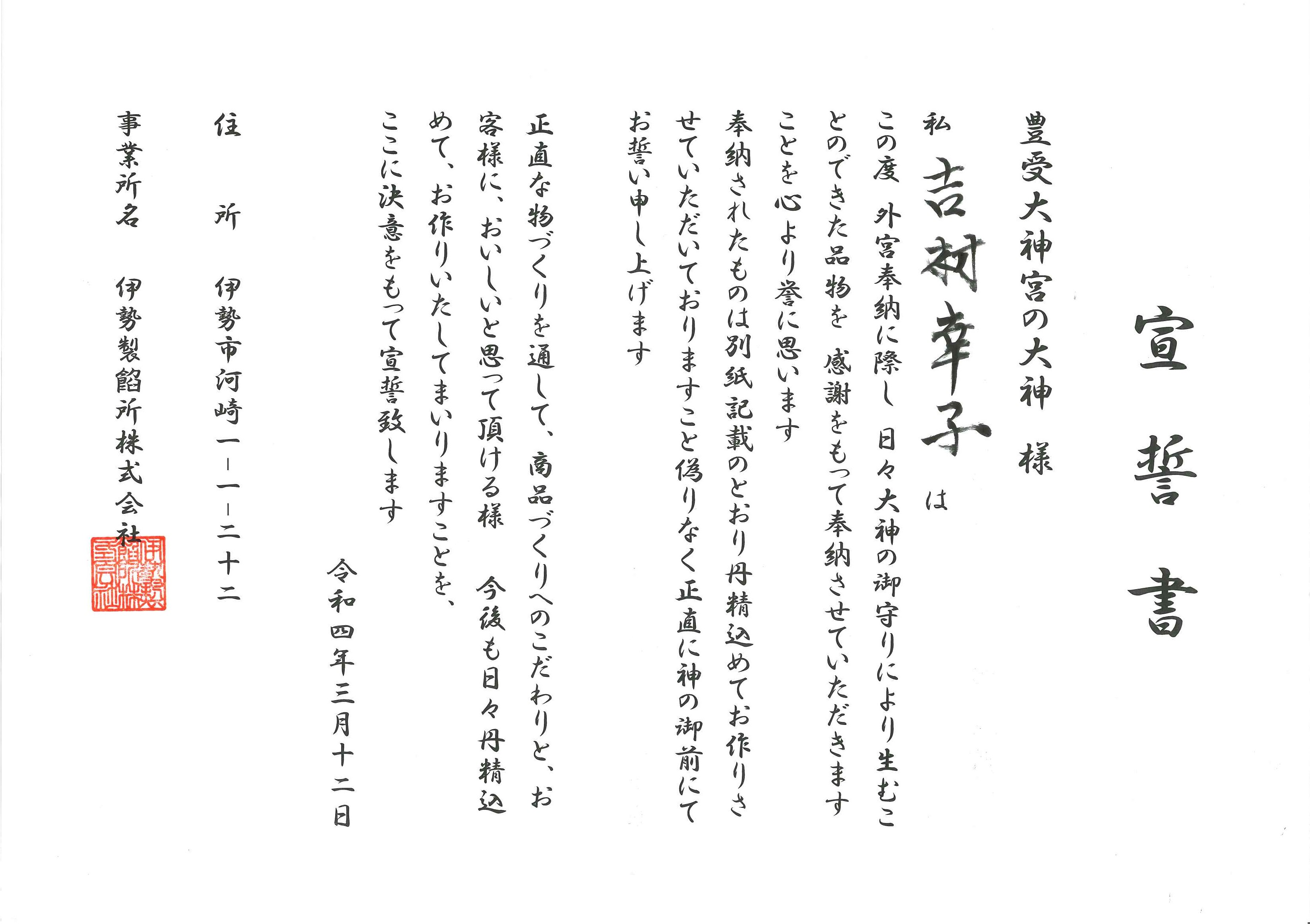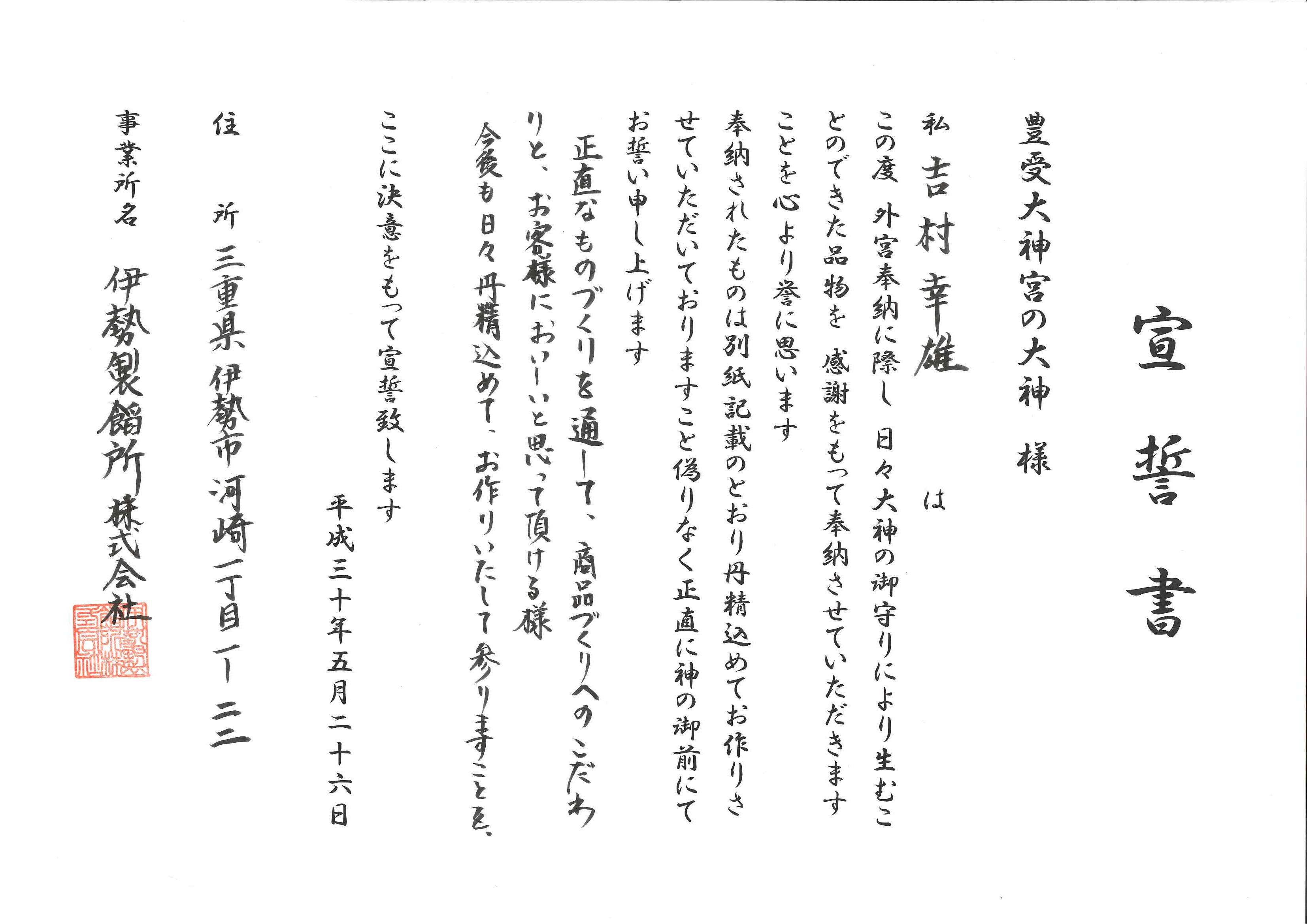20年に一度の遷宮を迎える年に、食に神様に感謝したく奉納し、より安心・安全な商品を作っていきたいと奉納しました。奉納を機に、伊勢を全国発信していきたいです。