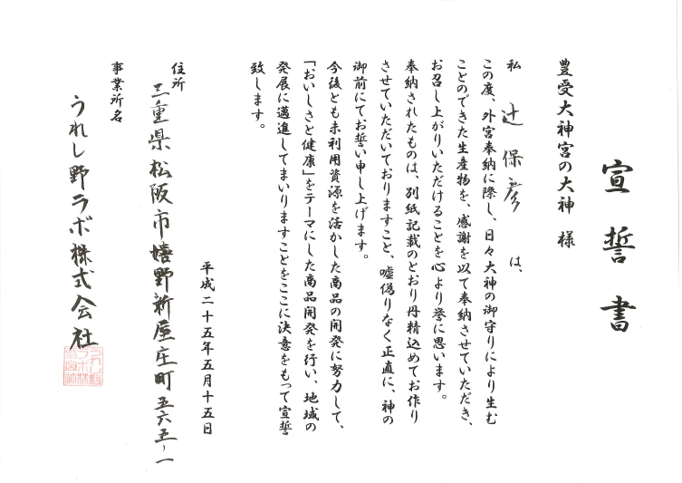 ≪伊勢のくに 嬉野から美と健康を創造する≫という企業理念のもと、「美しく健康でありたい」人のために、製品の提供や情報の発信を行ってまいります。今回、奉納させて頂きました商品は、弊社の独自の抽出技術によりできました新感覚の調味料3品です。