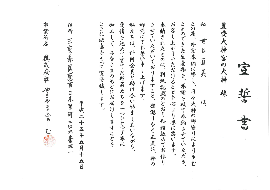 尾鷲商工会議所に薦められて参加しました。奉納して、商品ひとつひとつに自信がつきました。神楽・御垣内参拝もすごく身が引き締まりました。奉納後は、お客様から奉納商品をいただきたいとの連絡もあり、反響をいただいております。