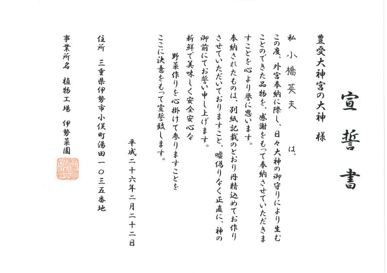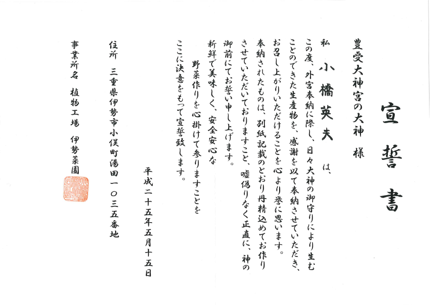 三重県農林水産センターからの紹介がきっかけで参加しました。食と産業の神様に奉納でき、身の引き締まる思いがしました。普段できない大変貴重な経験をさせて頂きました。奉納後は、お取引先の反応が良くなりました。これからも清潔で新鮮な野菜づくりに励みます。