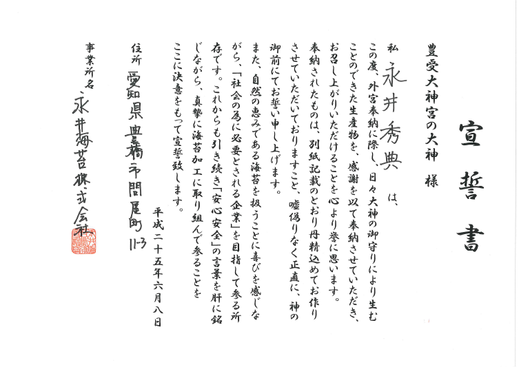 社是である「海苔・椎茸を通じて、社会の為に必要とされる企業となろう」をモットーに、皆様に広く愛される商品作りを心がけ、日々の食卓に彩りを添えられるよう努力して参ります。