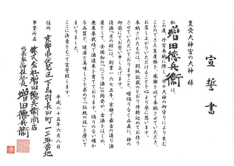 外宮奉納について教えて頂き、式年遷宮をきっかけに奉納しました。嘘偽りなく正直に神の御前にて誓うことにより、心新たに酒造りに精進します。