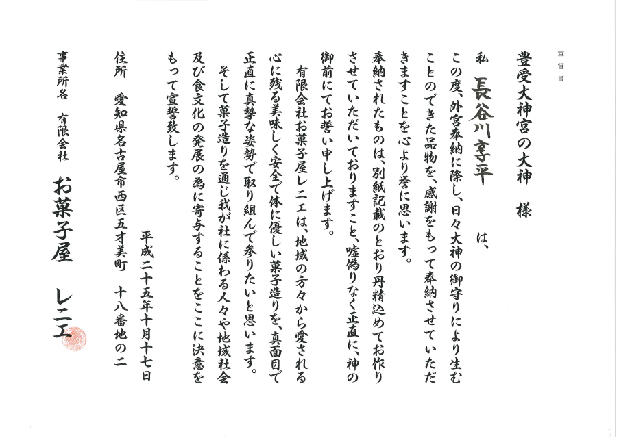 これからの菓子造りも御神前で誓った言葉通り、より一層の精進を重ねていく所在でございます。