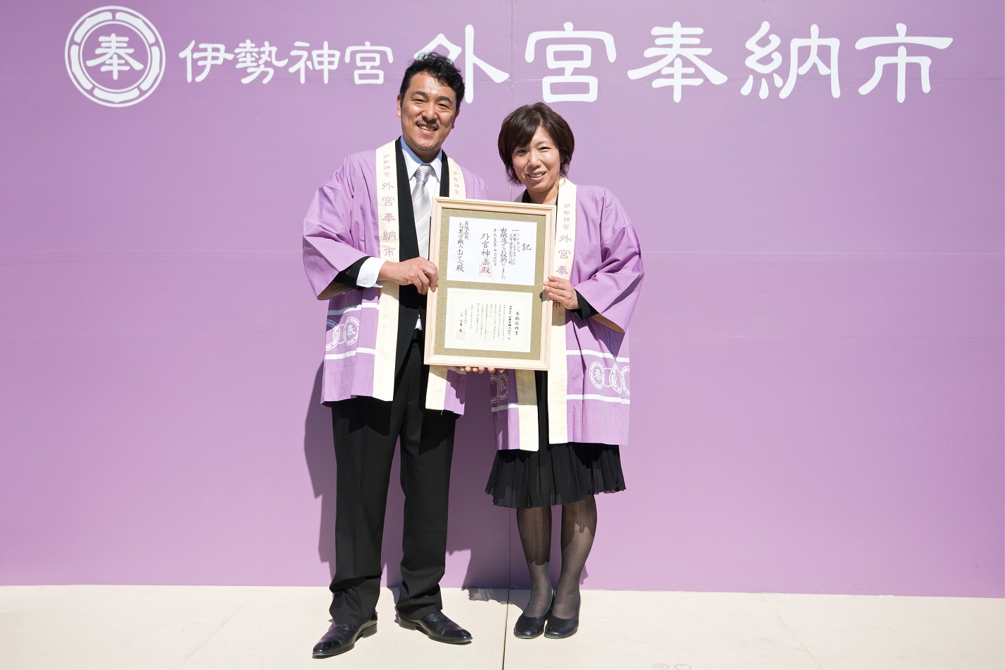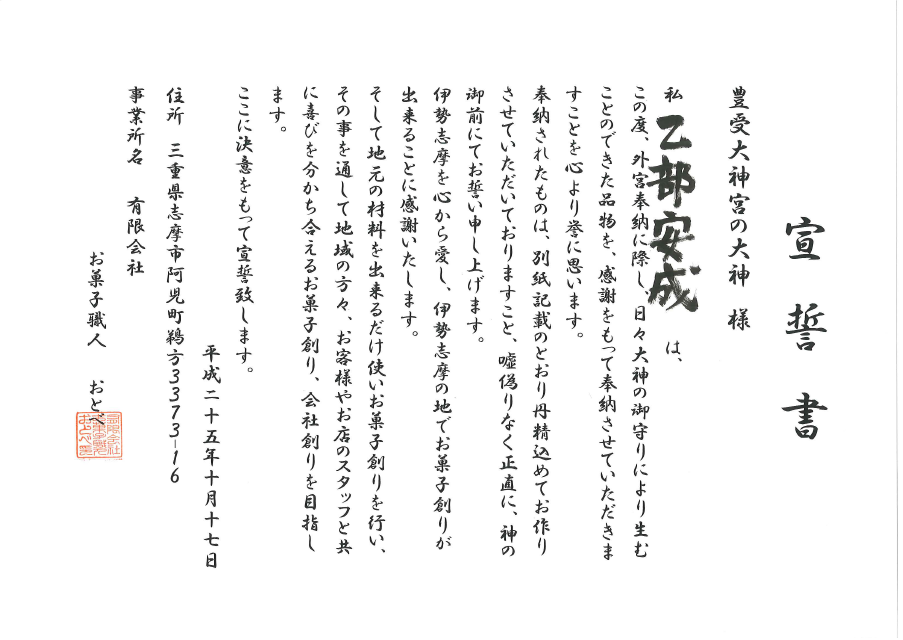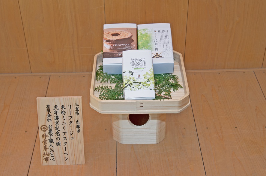 洋菓子の先輩方から奉納を勧めていただいたおかげで奉納のことを知りました。そして他県の皆様が奉納に参加されているのに、伊勢志摩の地元に店があるotobeが参加しなければいけないと思い参加させていただきました。今回式年遷宮の年に恵まれこのような機会を与えていただきありがとうございます。歴史の重み、伝承していくことの大切さを神宮さんに携わる方々の想いや大変さを深く感じ感謝いたします。今後は、お客様に今まで以上に自信を持って販売させていただき、このような素晴らしい機会をより多くの方々が参加できることを望みます。