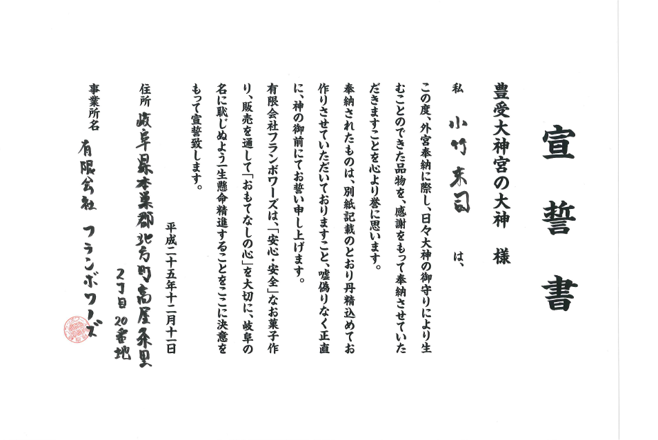 フランボワーズという店名は、ラズベリー(木苺)という意味のフランス語ですが、可愛らしくて親しみやすい響きの中に皆さんに愛されるお店に育てていきたいという願いも込められています。常にお客様への感謝の気持ちを忘れず、一人でも多くのお客様に喜びと満足をお届けできるようなお菓子作りを目指しています。そして、お菓子の多彩な魅力、美味しさの新たなカタチを提案、発信していきたいと思っています。これからもチャレンジ精神、ハングリー精神で日々進化し続けるフランボワーズにぜひご期待下さい。