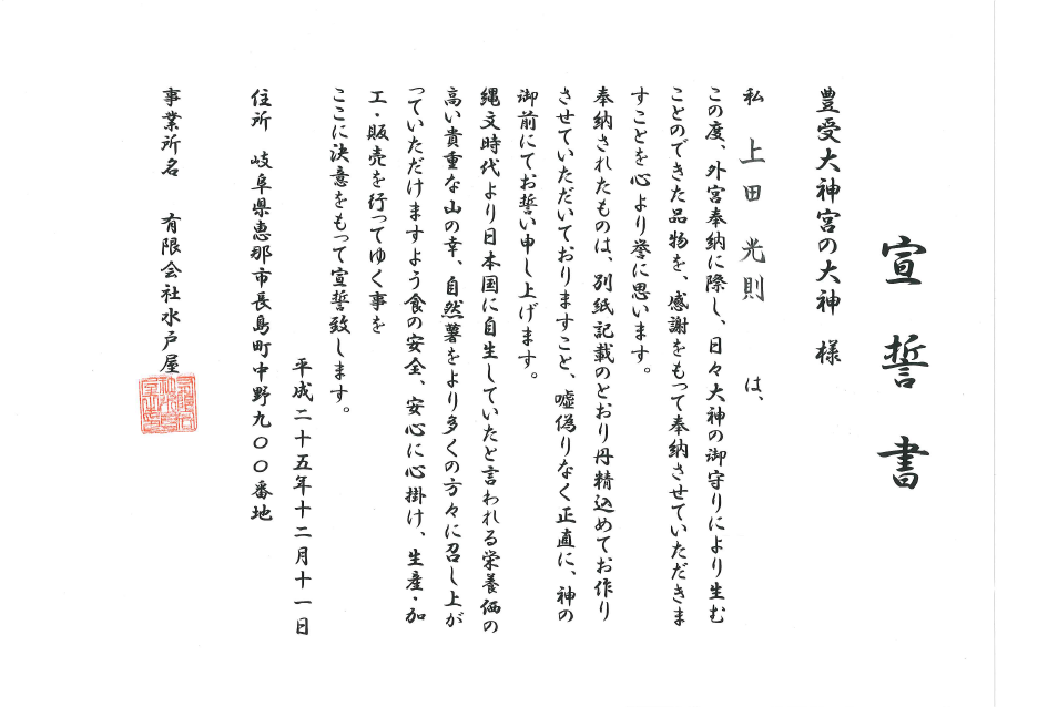 生産や販売とは別に、”食”という原点で考えてみたかったので奉納しました。奉納したことで、今後、清々しい気持ちで何事にも取り組めそうです。神楽・御垣内参拝にも大変感激しました。生産責任・販売責任を強く感じるようになりました。