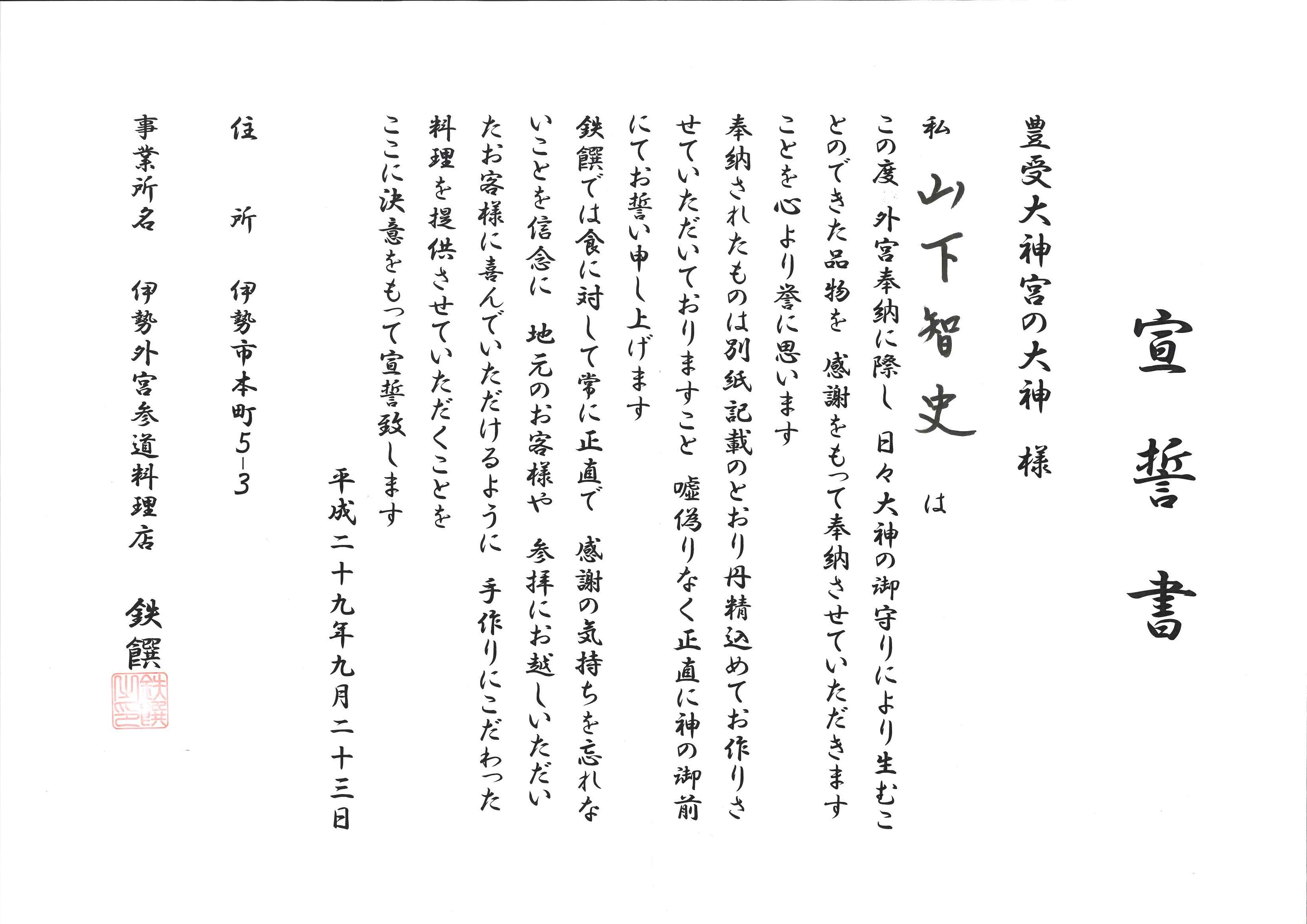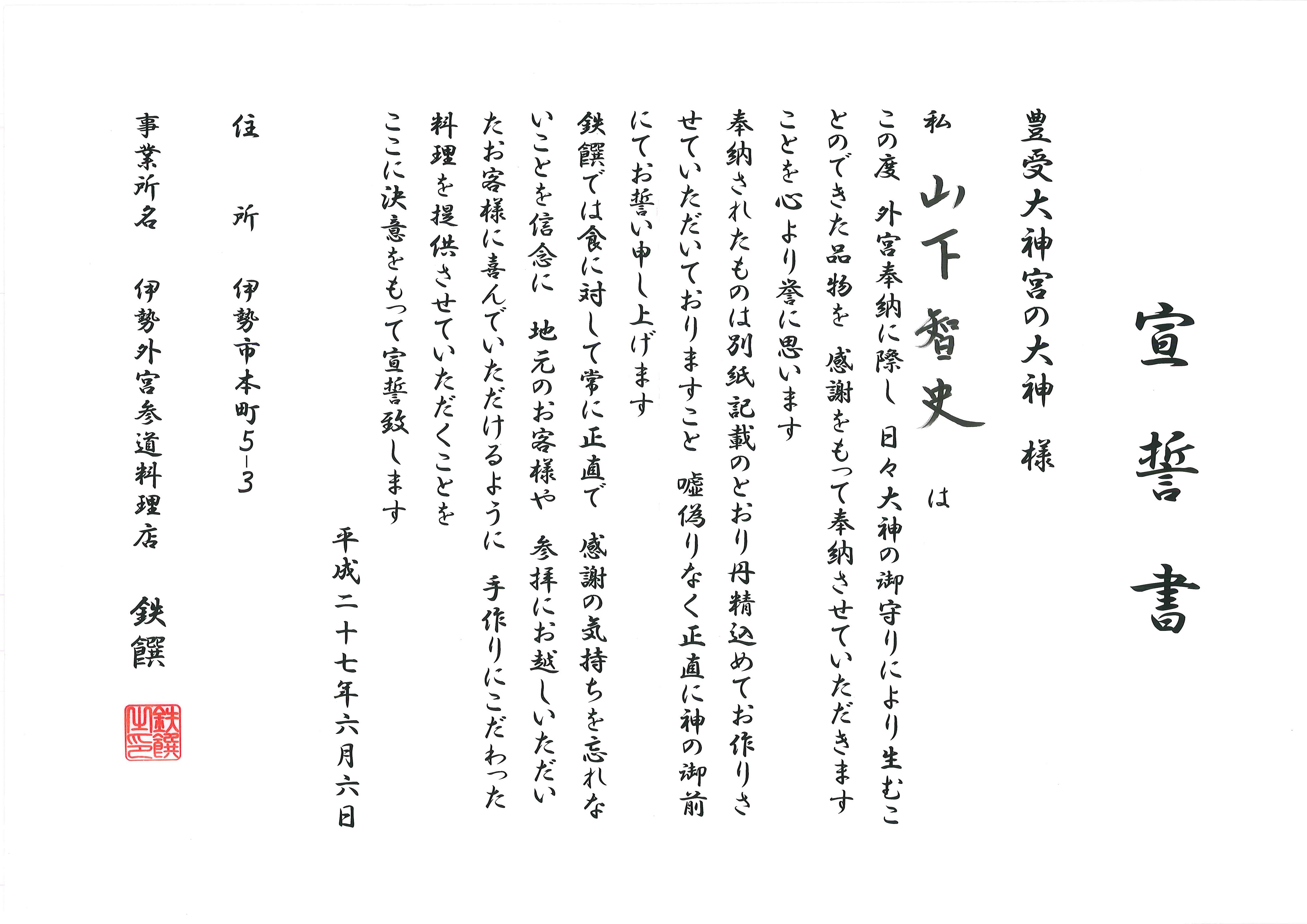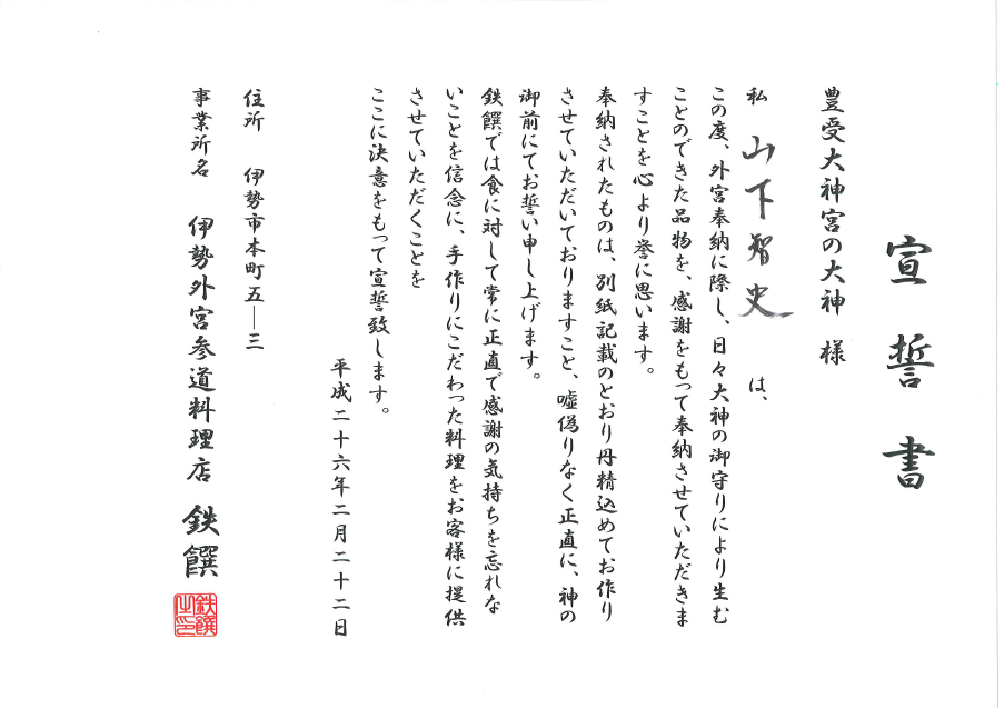 『食』の神様のお膝元で開店させていただけたことの感謝を奉納という形で感じたかったので、今回の奉納に参加しました。改めて、『食」と『お客様』に常に正直に感謝の気持ちを忘れないものづくりをしようと思いました。背筋が伸びる思いでした。素晴らしい体験でした。奉納後は、スタッフ全員が正直なものづくりをお客様に提供しようという思いを強くしました。奉納と奉納市によって、今後さらに外宮界隈が賑やかになればいいと思います。