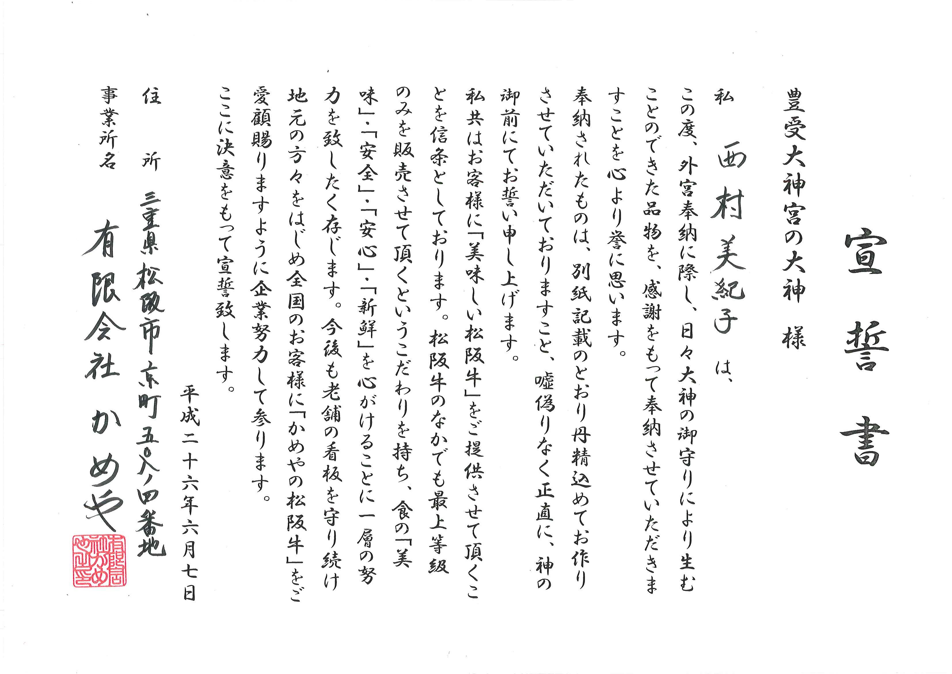 農家の方が丹精込めて育て上げた極上の松阪牛を厳選し、巧みの技で熟成し、スライスする厚さにもこだわりを持ち、今後も最高の松阪牛を販売させて頂きたく存じます。お客様からの「美味しかったです」という一言を喜びとし、食のコンプライアンスにも遵守し、最高の松阪牛の販売に精進して参ります。精肉店も併設しておりますので、極上の肉をお値打ち価格でご提供させて頂ける店でございます。屋号も”寿に”ちなみに鶴亀の「亀」を使っております。松阪駅JR改札口より徒歩1分の好アクセスの位置にございます。駅前に位置しますので年中無休で皆様のご来店をお待ち申し上げております。牛肉を吟味して販売しておりますので、売り切れてしまいましたら終了とさせて頂いております。皆様、どうぞ宜しくお願い申し上げます。