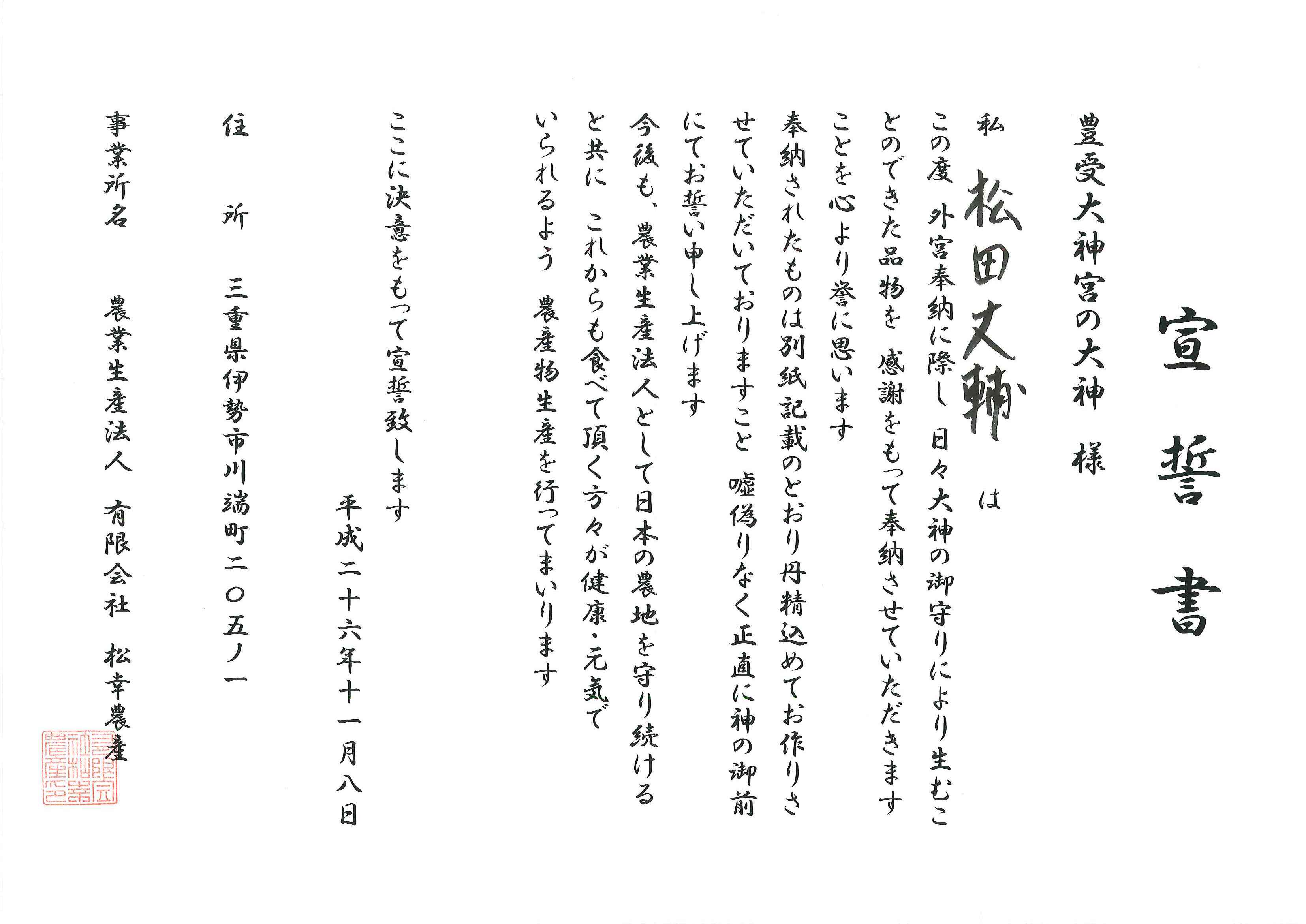 松幸農産は、地域農業の担い手です。高齢により離農される農家さんから農地を借り受け、次世代へ引き継ぐべく耕作を続けており、また、自分たちが作った農産物を消費者へと直接販売することで食べて下さる方との信頼関係を築き、顔の見える農業を続けております。 肥沃な伊勢平野、清流宮川の水、温暖な気候と古来より米作りには最適の農環境の中、米作りへの長い経験と情熱、さらに科学的な土壌診断と継続的な土壌改良。 お米のためにできる全てをつぎ込んだ自信作です。 今後も真剣に農業に向き合うべく、食の神様である豊受大神様への奉納を通じて「正直なものづくり」を誓います。