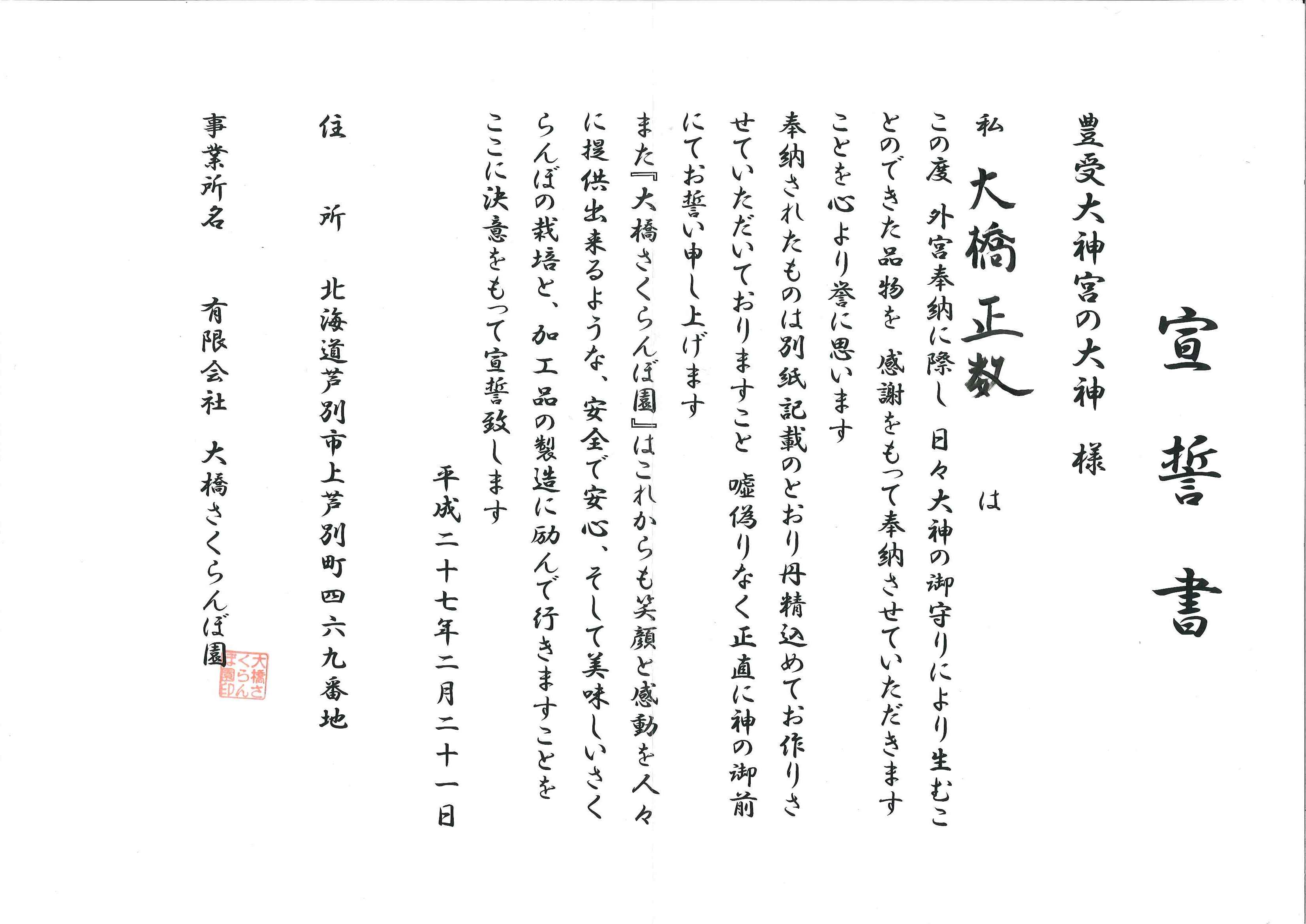 この度、「さくらんぼチーズタルト」、「さくらんぼパイ」、「さくらんぼジャム月山錦」を外宮に奉納できる事を心より嬉しく思っております。これからも北の大地に育まれた安心・安全な「北海道のさくらんぼ」と「さくらんぼの加工品」を全国の皆様にお届けしたいと願っております。