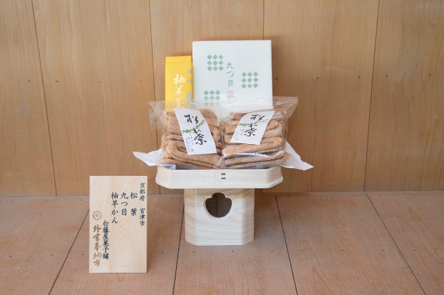 日本三景天橋立の松並木の松の葉をモチーフに、一本一本手切り製型し焼きあげる菓子