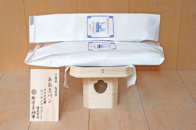 今回奉納させて頂く「あおさパン」は三重県産の「あおさ」を使い、風味を損なわいよう一つ一つ手作りしており、皆様のご好評いただいております。数量限定ではございますが、フロントにて販売もさせて頂いております。