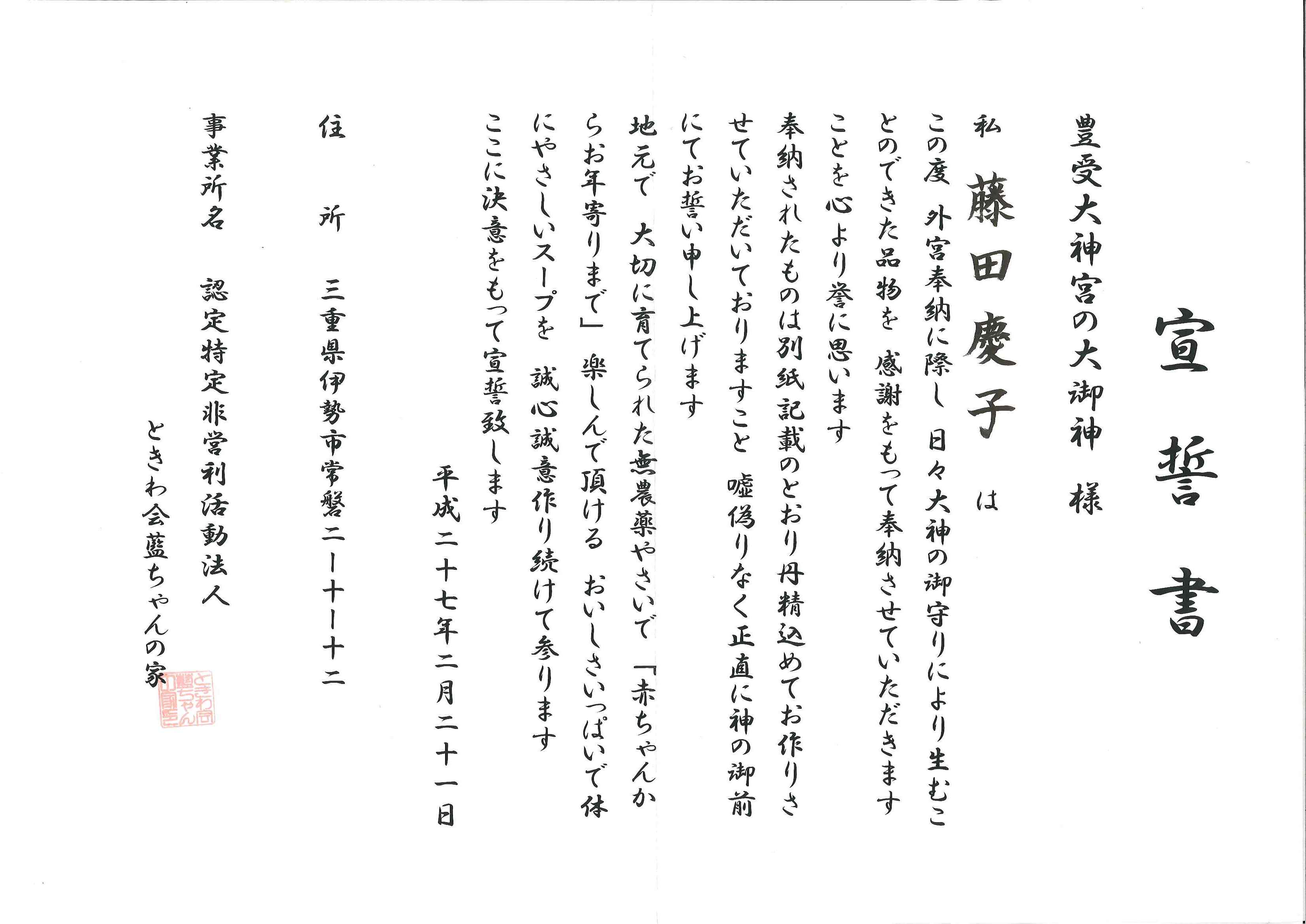 雲一つない、春寒の朝、外宮奉納に参加させて頂けた事、心から感謝申し上げます。奉納の重みを感じ、三重の恵まれた自然の中で育まれた食材で一つ一つ丁寧に作っていく事へ意識が改めて高まりました。ものづくりに対して、人に対して、地域に対して、いつも正直で近くで寄り添える。そんな事業所でありつづけたいと思います。
