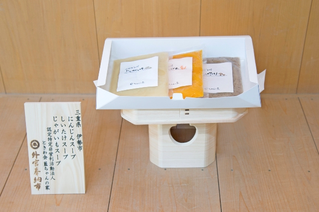 平成15年に高齢者向けのお弁当を自宅へ配達を行う配食部を開始し、治療食、アレルギー対応食等も行い、地域の食のお困りごとへの支援も行ってきました。平成26年惣菜部を新たに立ち上げ今まで研修、実行してきた真空調理等の技術を生かしてお総菜の販売をしています。「赤ちゃんからお年寄りまで」の設立当初からの想いを形にと、季節の野菜スープの開発を行いました。伊勢のこだわり無農薬野菜の生産農家の協力もあり、ブイヨンも県内産鶏がらを使用して調理し、調味料も塩のみで、低温スチームにより野菜そのもののおいしさを引き出した、安心安全な「おやさいスープ」が完成しました。「にんじんスープ」「しいたけスープ」年中お届けできます。