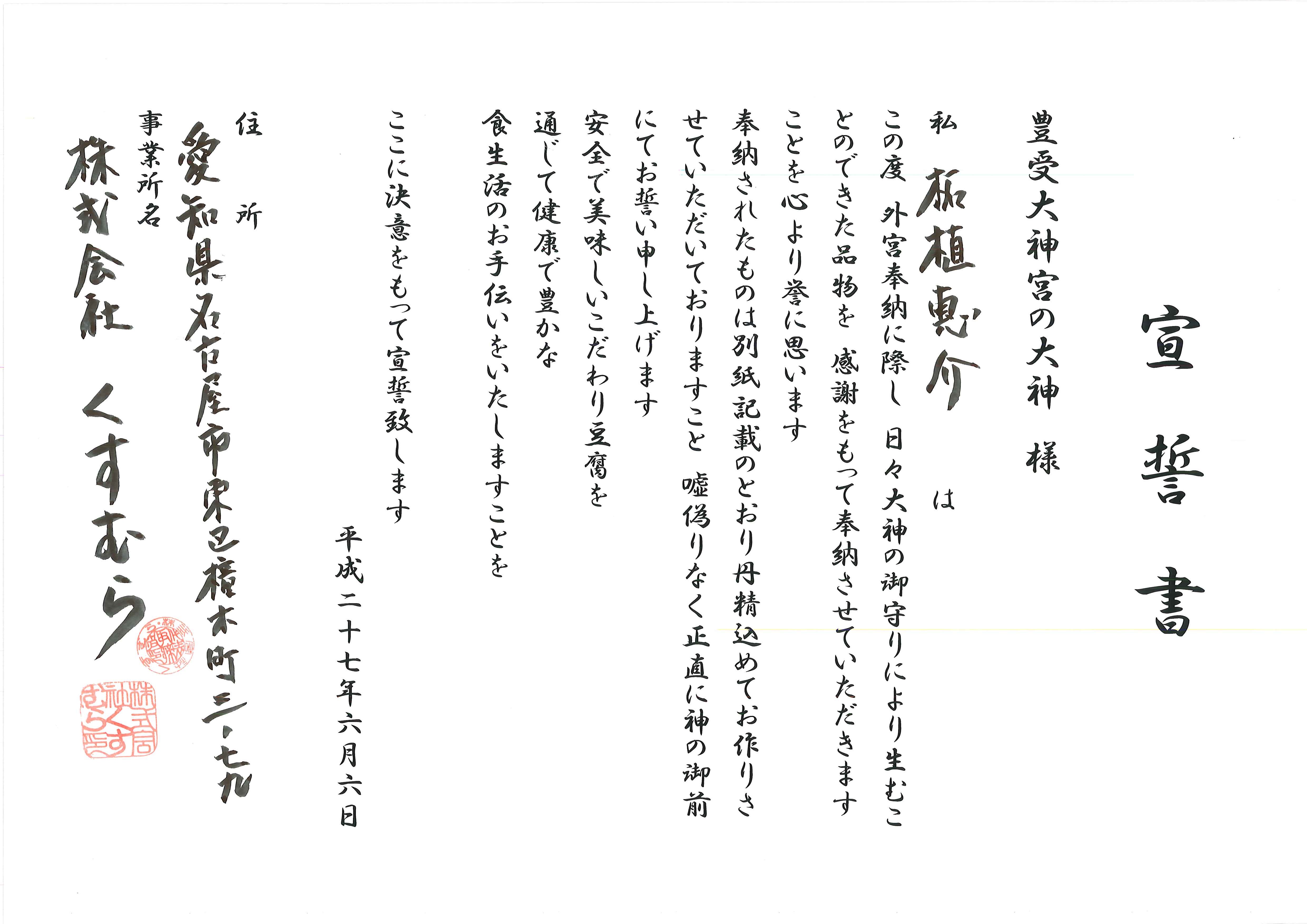 食の神様である「豊受大見神」に奉納する事ができ、これからも安全で美味しいこだわり豆腐を通じて、健康で豊かな食生活のお手伝いができる様に、お豆腐作りに邁進して参ります。