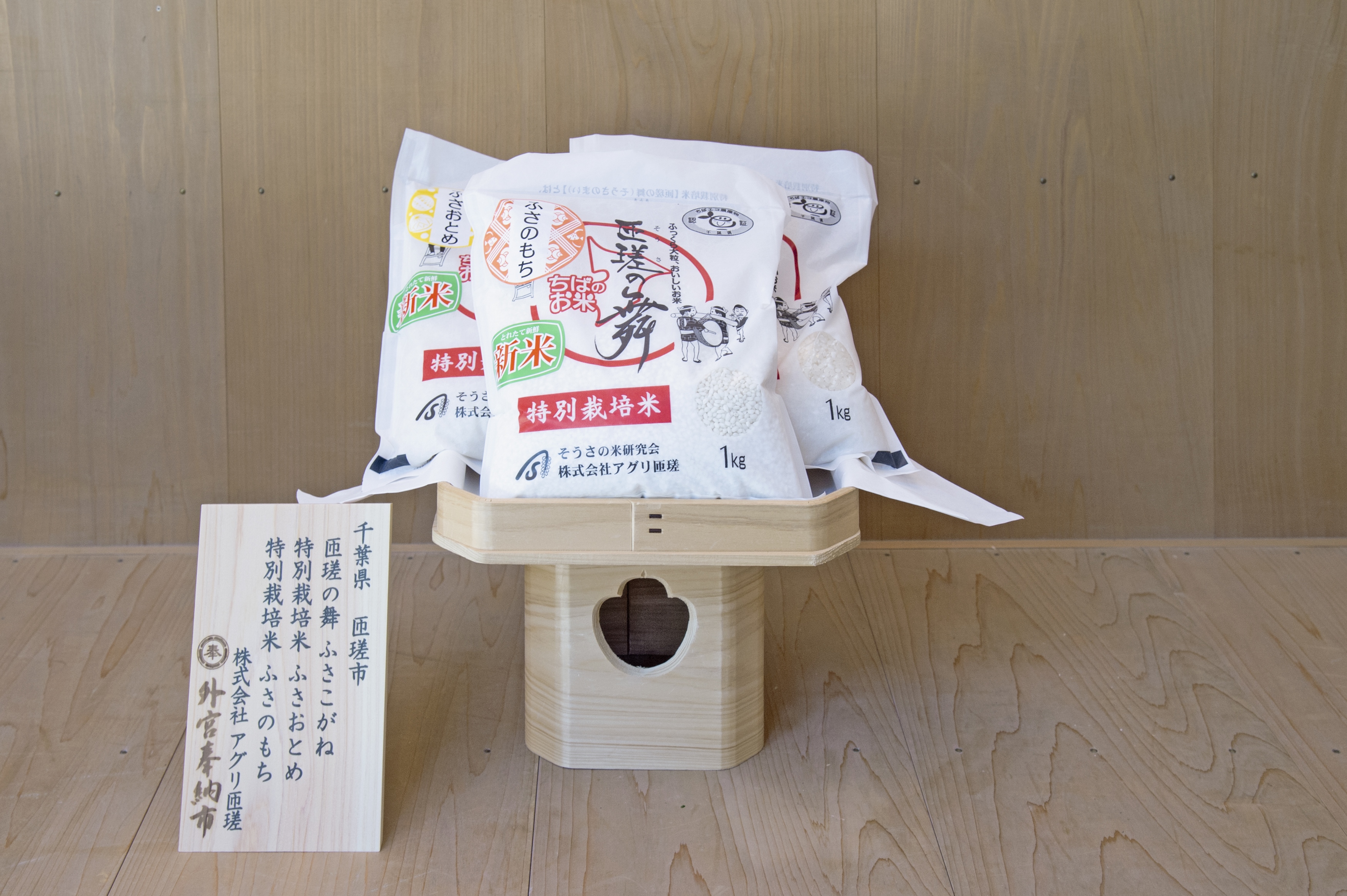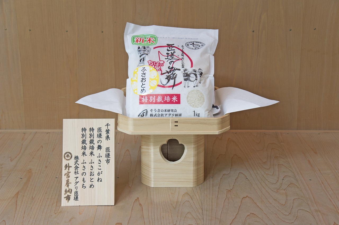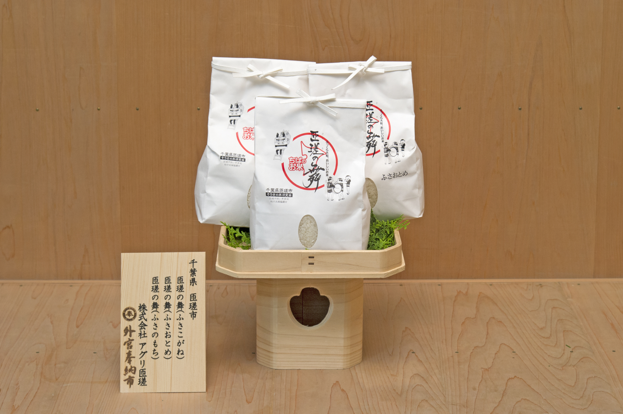 『匝瑳の舞』は、肥沃な匝瑳の大地で美しい麻の布がきらめいて舞っているようにすくすくと健康に育ったお米であることを表現しています。そして、ふっくら大粒美味しお米、『匝瑳の舞』により匝瑳市が日本中に知られることを夢見て名付けられました。生産にあたっては、千葉県認証の減農薬・減化学肥料栽培を行っています。また、食味値が良く低タンパクであり、美味しさにこだわった栽培を取り入れています。炊き上がりはふっくら大粒、冷めても適度の硬さと甘みがあります。第2回サンマリノ神社建立2周年記念祭に参加しました。『匝瑳の舞』をよろしくお願いいたします。