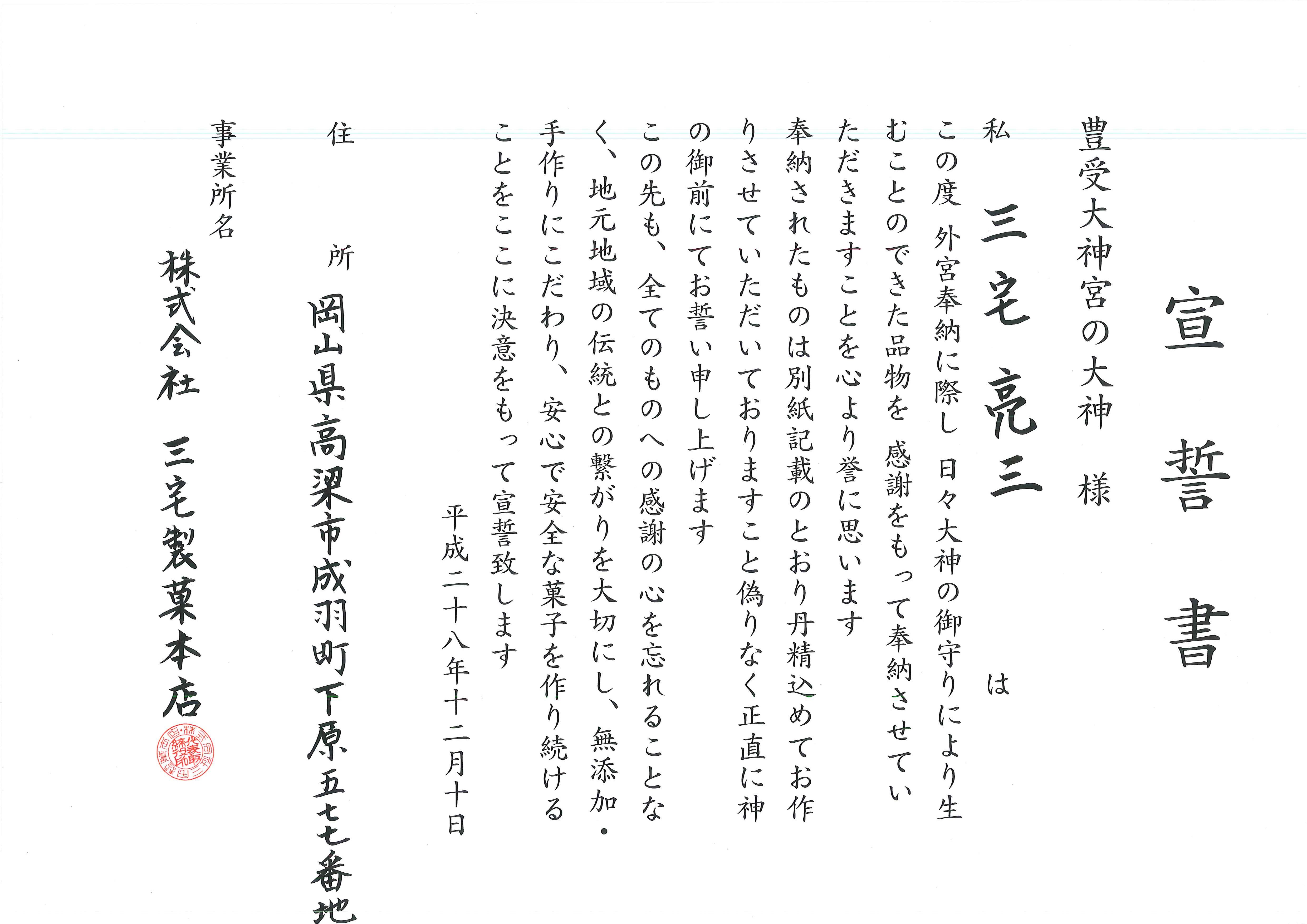 ご贈答としてはもちろん、大変地方色豊かでインパクトの大きい菓子ですので、備中地方だけでなく岡山県のお土産として約60年間親しまれている最中です。素材の良さにこだわり、乳化剤や着色料・香料・保存料等、添加物を一切使用せず、手作りにこだわり製造しております。