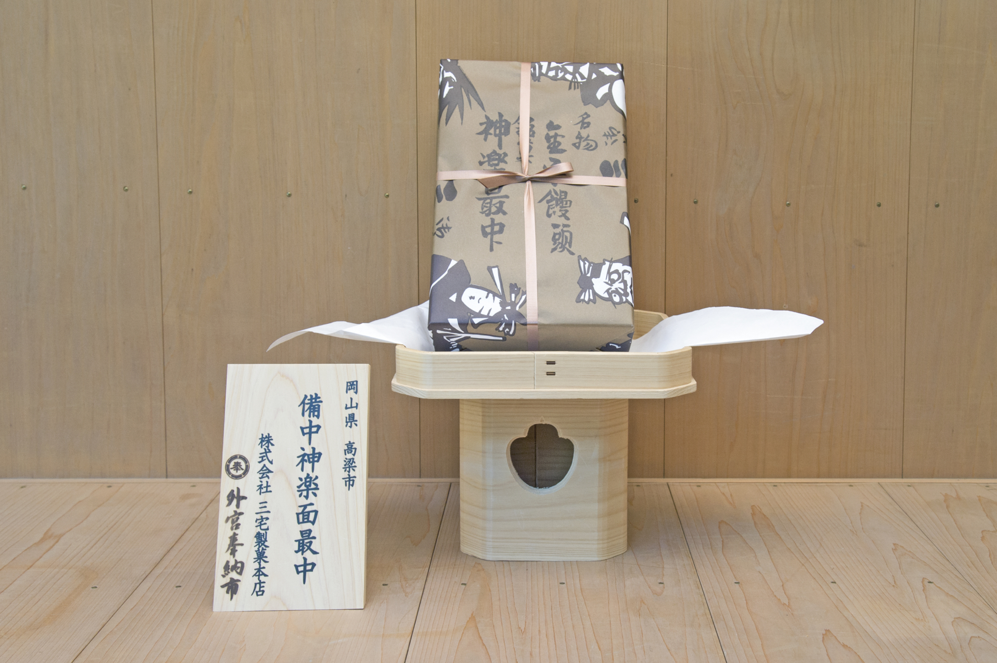 お面の形の最中種を始め、進物箱や包装紙など随所に備中神楽からヒントを得た図案を用いております。