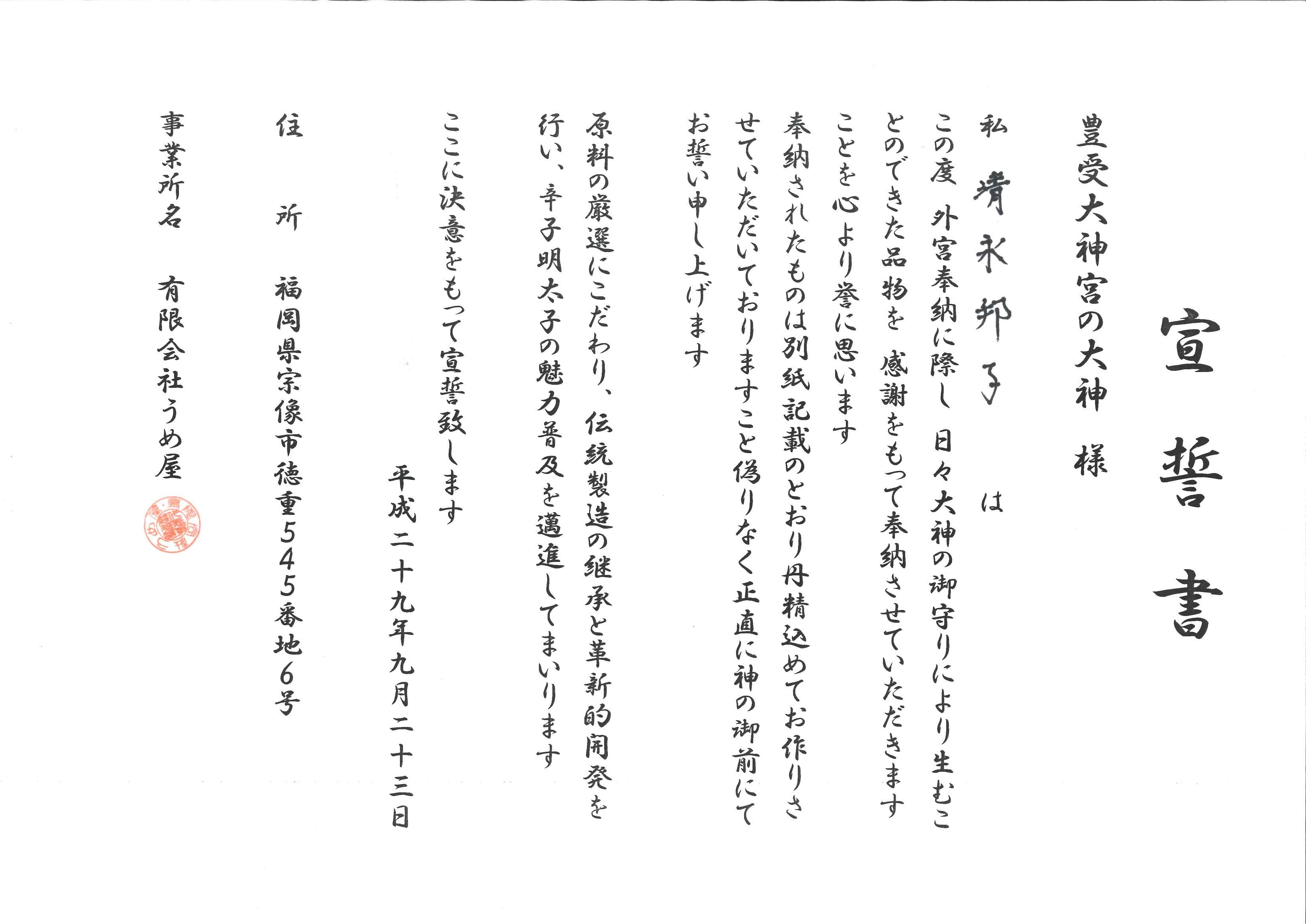 私たちうめ屋のこだわりは、目の行き届く範囲で製造し、納得したものだけを 製品として世に出すことだと考えております。何よりもモノ作りにこだわった会社でありたい。そして、人と人のおもいをつなぐ製品づくりをしていきたい。そのおもいの架け橋として、“からしめんたいこ”があってほしい。正直な気持ちで社員一同誠心誠意努めてまいりますので、 今後ともよろしくお願い申し上げます。