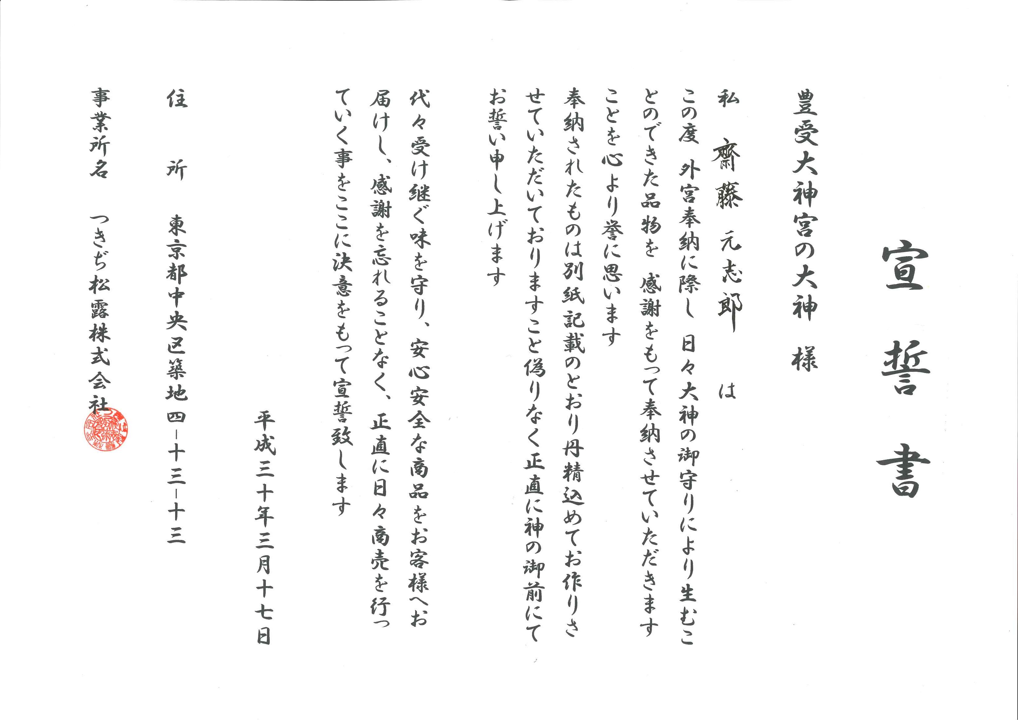 昭和58(1983)年に百貨店の食料品売場への進出を果たした際には、築地界隈ではそこそこ名の知られた松露も、目と鼻の先の銀座ではまったく無名であることを思い知らされました。以来、首都圏を中心に各地の百貨店でもお取り扱いいただき、徐々に玉子焼松露の味を皆様にご賞味いただけるようになりました。その思いを忘れずに、これからも、この味を守り続け、真面目に商売に取り組んで参ります。松露のはじまりは築地ですが、松露の味は江戸前限定ではありません。日本全国の方々に喜んでいただける玉子焼であることを願っています。