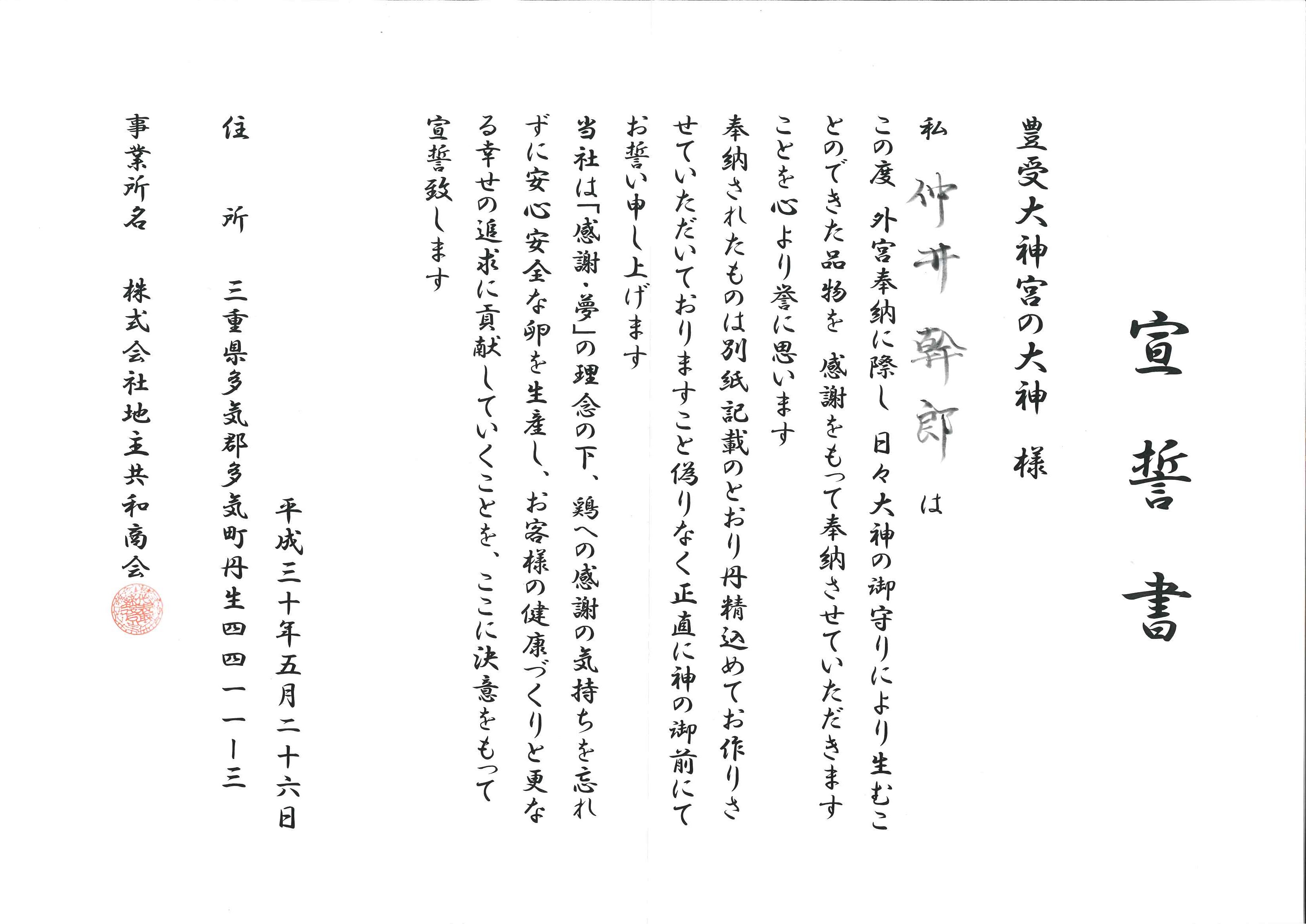 当社の理念である「感謝・夢」を胸に、若い人にも魅力のある会社であり続けることを目指しています。ストレスの少ない平飼いの飼育方法は、鶏が伸び伸びとした環境で自由に運動することができます。これからも安心・安全へのこだわりを追求し、食の恵み、鶏からの恵みに感謝の気持ちを捧げ、奉納させて頂きます。