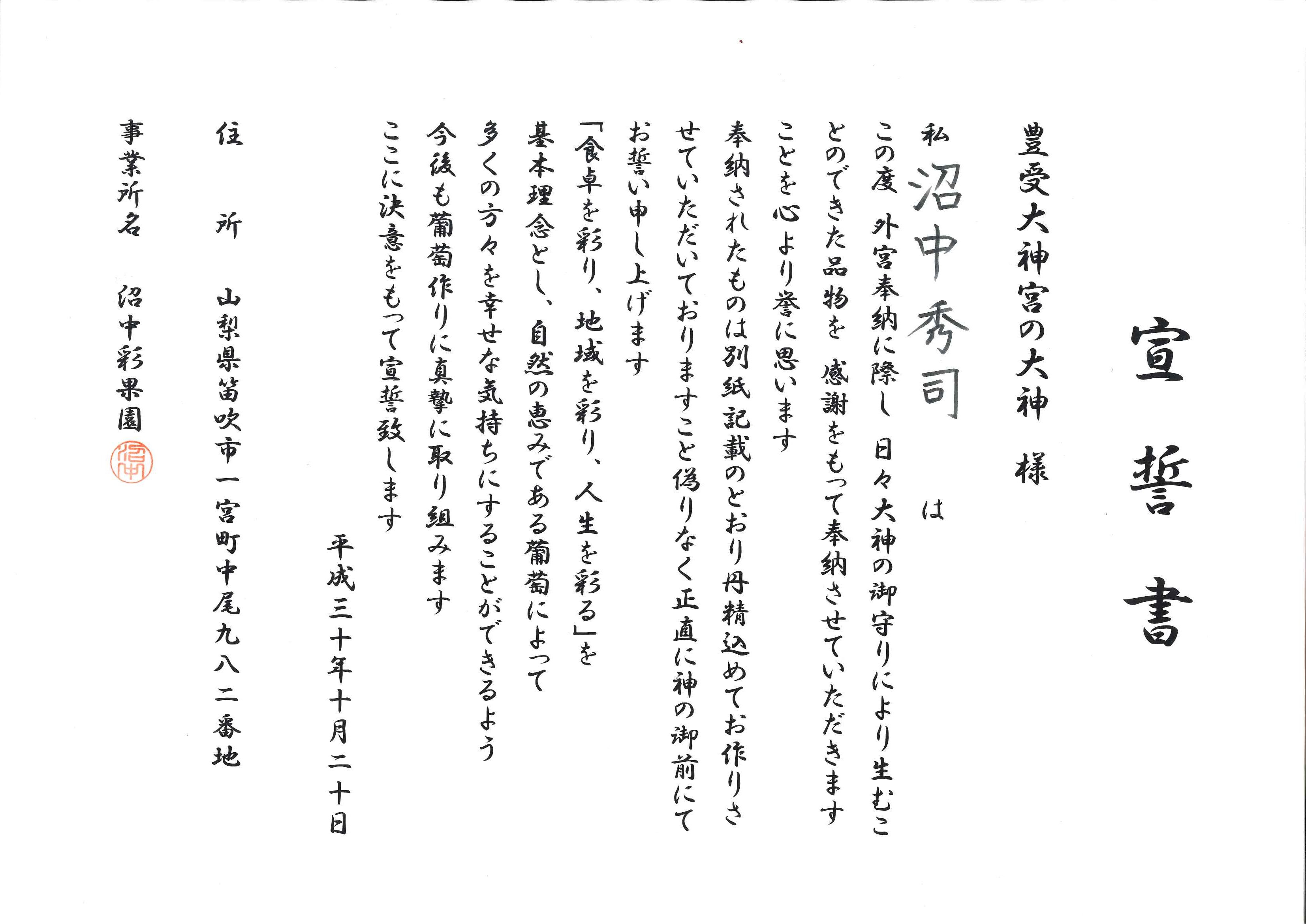 厳粛な雰囲気の中、奉納させていただきました。改めて、これからも葡萄作りに真摯に取り組む心構えができました。