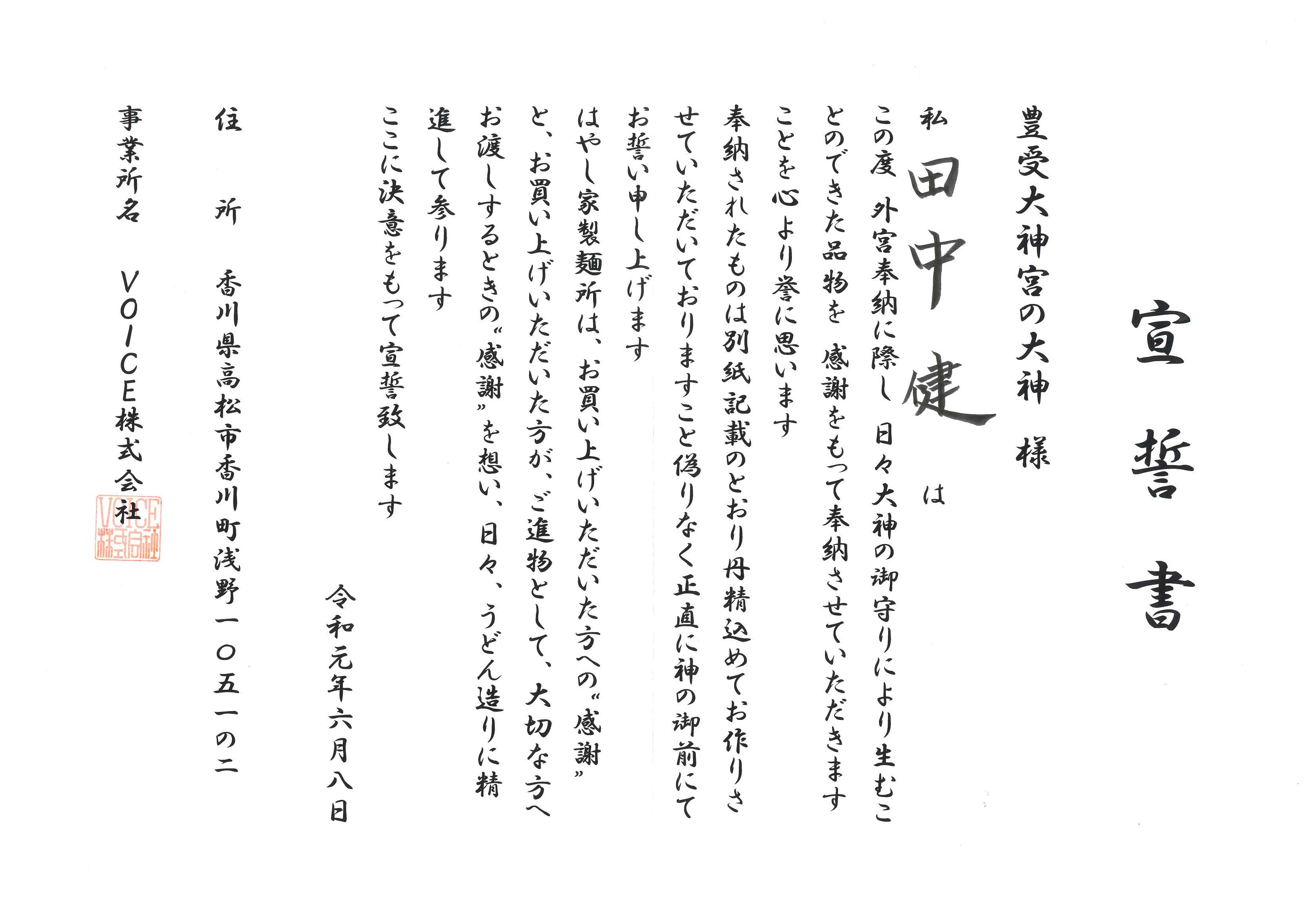 令和元年、最初に弊社の「一期一会」「黒箱うどん」を奉納させて頂く事ができ心から感謝申し上げます。今後も将来にわたり「正直なものづくり」の精神で一つ一つ丁寧な製品作りに邁進してまいります。