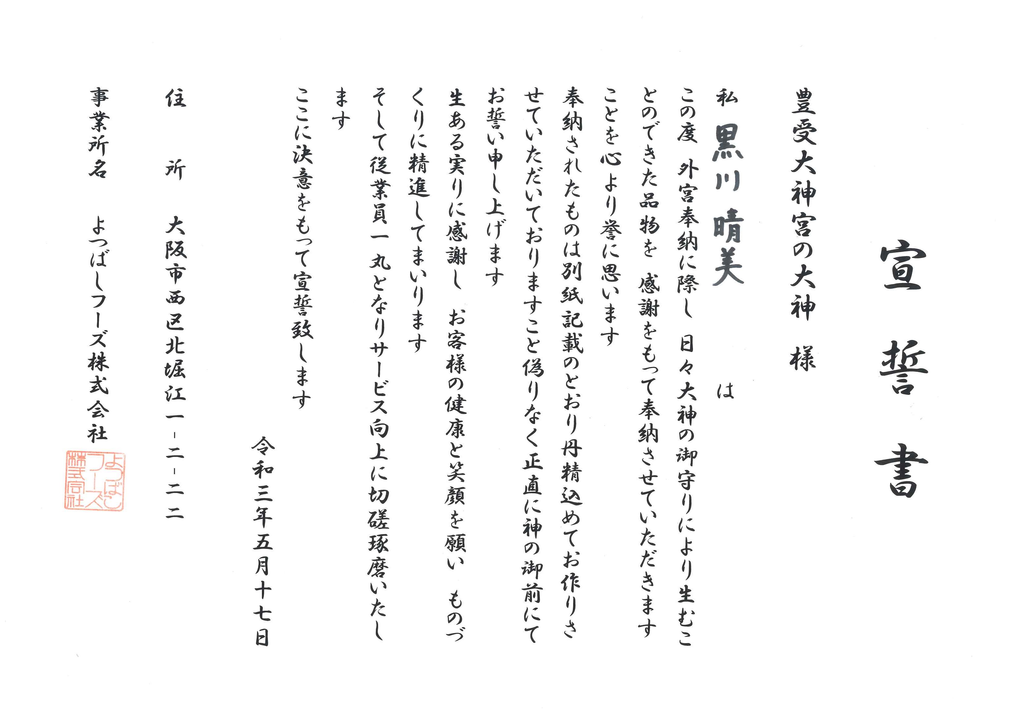 よつばしフーズ株式会社は、設立以来、食を通じてお客様の笑顔と健康を願い運営してまいりました。この度、伊勢神宮奉納にかける思いは、自然の生命に感謝し、実りを余すことなく調理させていただくことを誓い、今後より一層もの作りのプロとして精進してまいる所存であります。