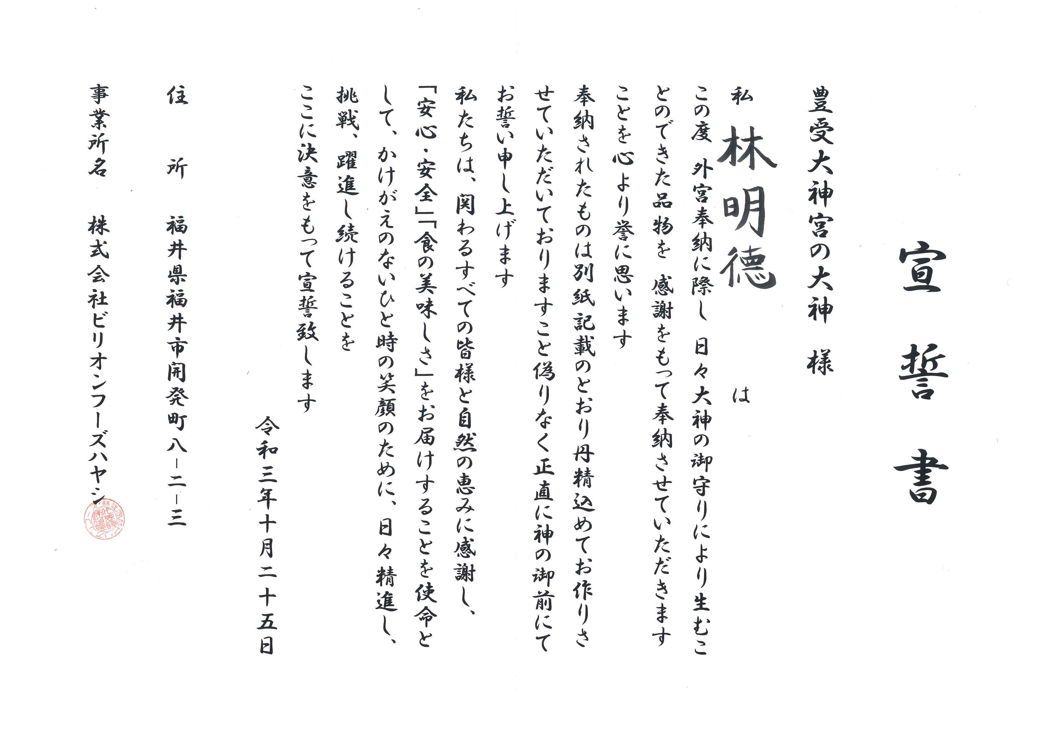 私たちは、地域の皆様に「安心・安全」、「食の美味しさ」をお届けすることを使命として、より良い品質へのこだわりを持って商品づくりを行っております。奉納品の「ビリオン珈琲マンゴープリン」と「ビリオン珈琲ドリップパック」は、贅沢な本物志向の味をご家庭でお楽しみいただけるように、開発に力を注いだ商品です。今後も「人」の思いやりの力と「商品」の魅力を通じて、幸せなひとときを提供いたします。ぜひご賞味いただければ幸いです。