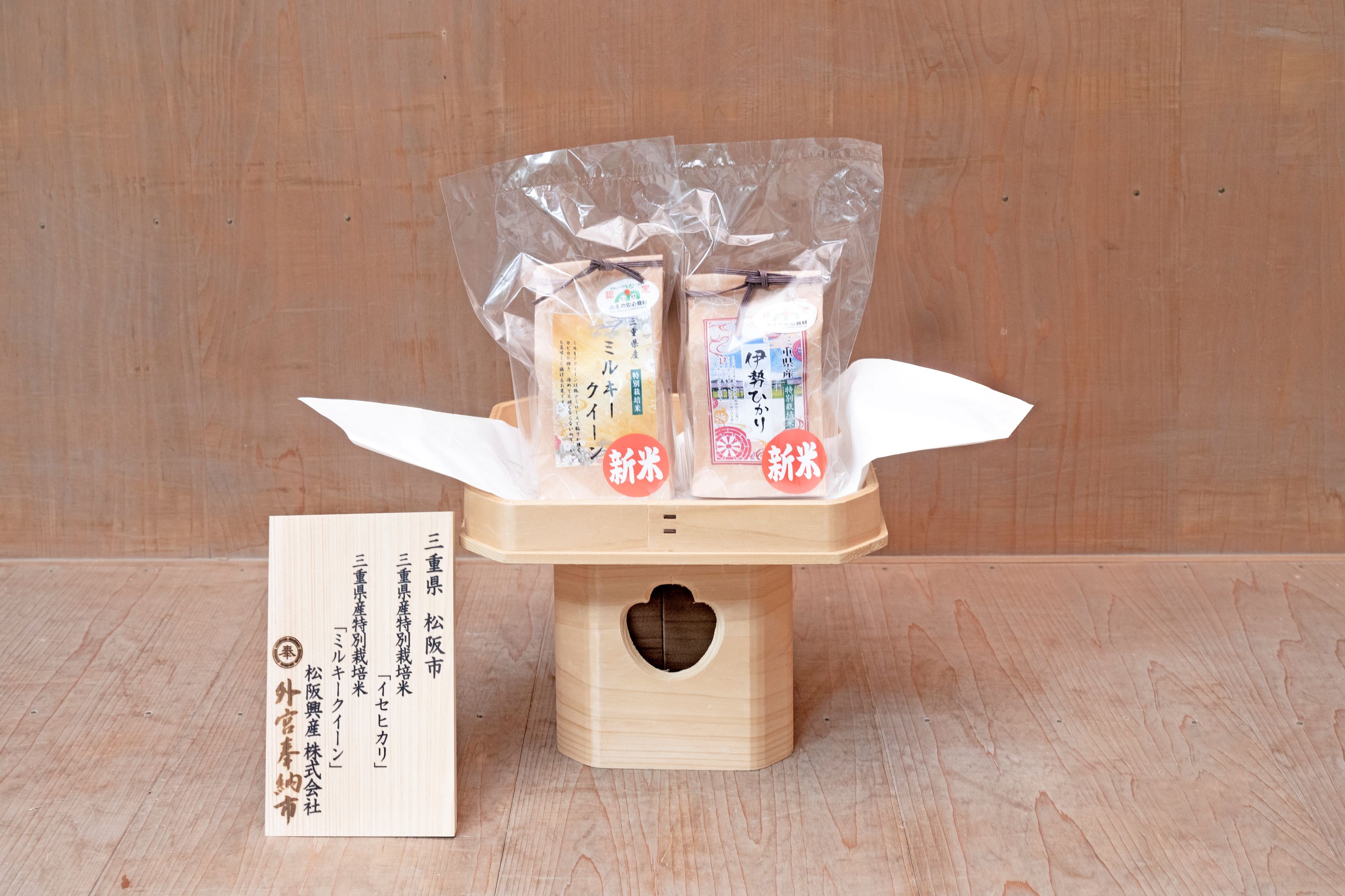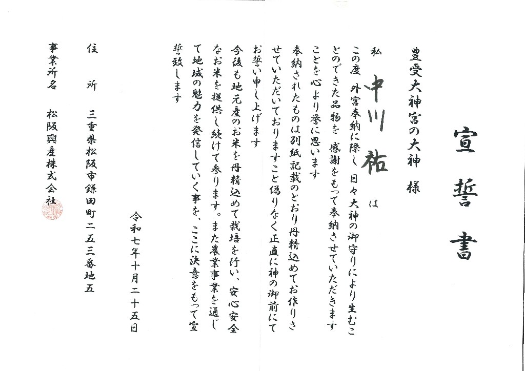 | 奉納品 | 三重県産特別栽培米「イセヒカリ」 |