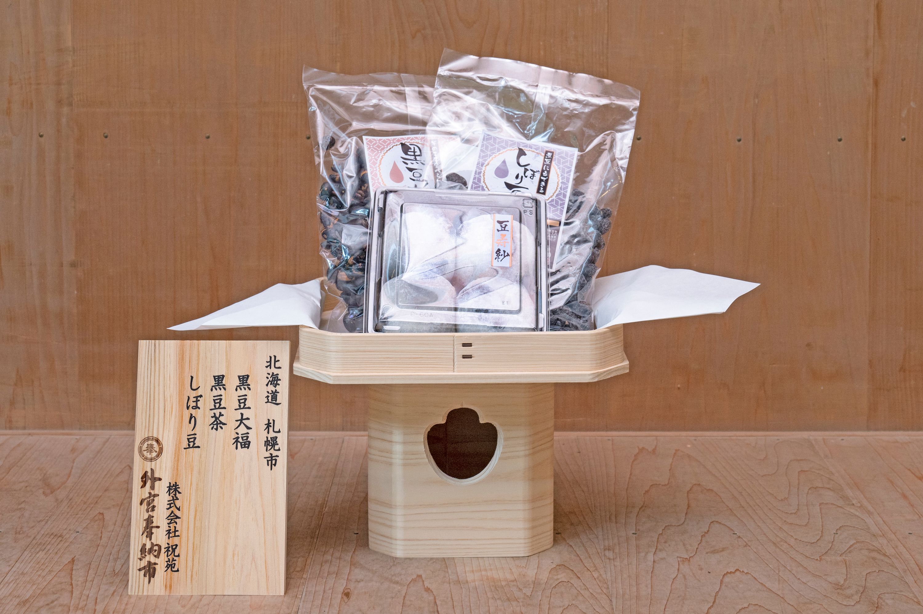 事業内容 | 弊社は、黒大豆製品を中心に北海道産、北海道製造の商品にこだわり、販売及び卸しの事業を行っている会社です。 奉納品の「黒豆大福」、「黒豆茶」、「しぼり豆」を中心に全国の百貨店様で行われている【北海道物産展、全国うまいもの市】などの催事に出展し販売をしております。 |