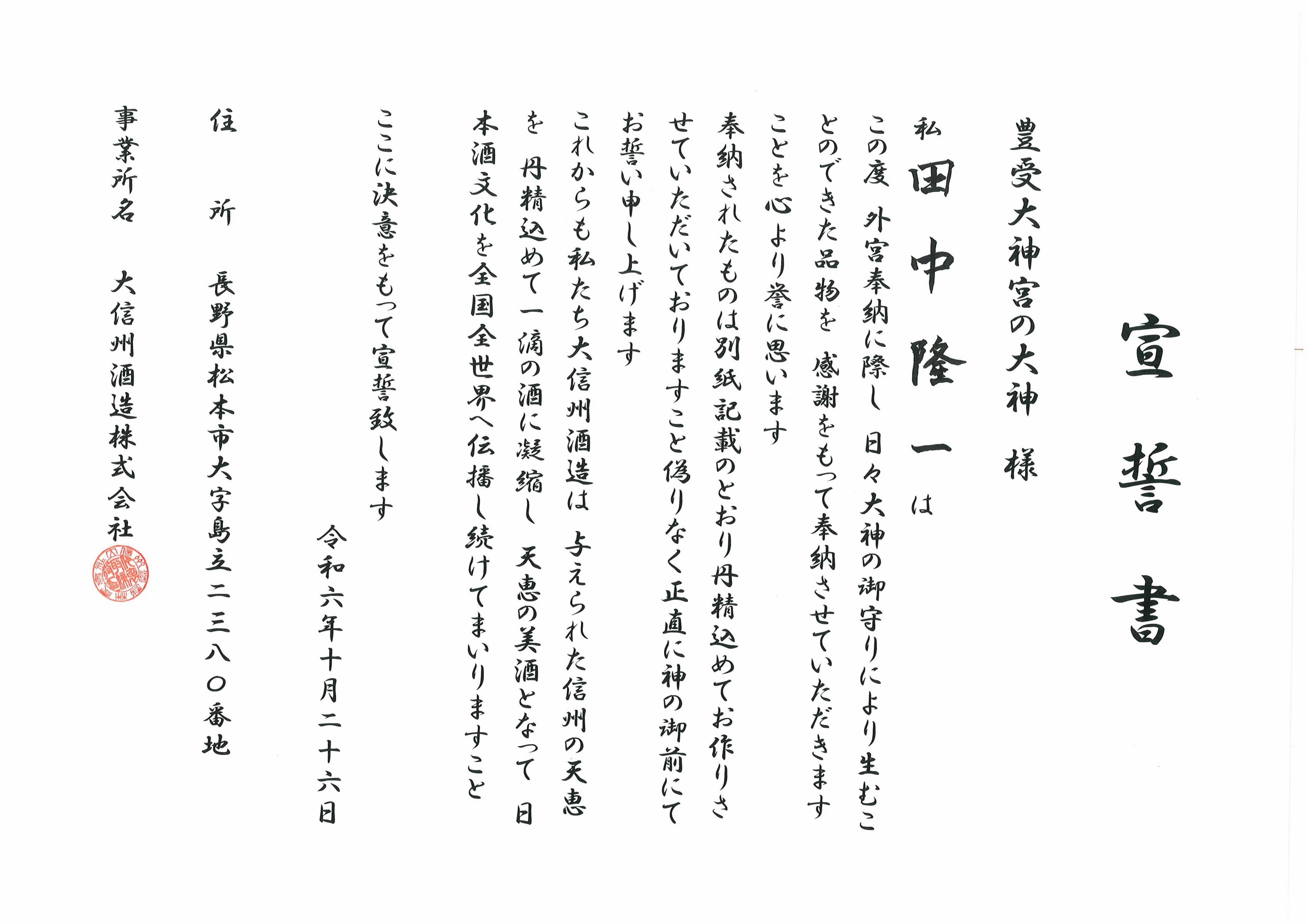 北アルプスの山々が育んでくれる天然水、特別な酒米が収穫できる自然環境、熱意にあふれた酒米農家、おいしく飲んでくれるお客様、ともに働く仲間、そしてわたしたちの志。どれかひとつが欠けても大信州の酒造りは成り立ちません。 わたしたちの酒造りは、そのとりまく環境の有難さに感謝を捧げながら造る「愛感謝」仕込みです。
