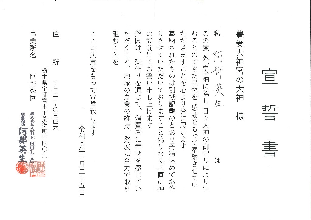 | 事業内容 | 栃木県宇都宮市で梨作りを営んでいる阿部梨園(株式会社 ABE HOLIC)です。 栽培面積4.2ヘクタール、20種類の梨を栽培しております。 |
