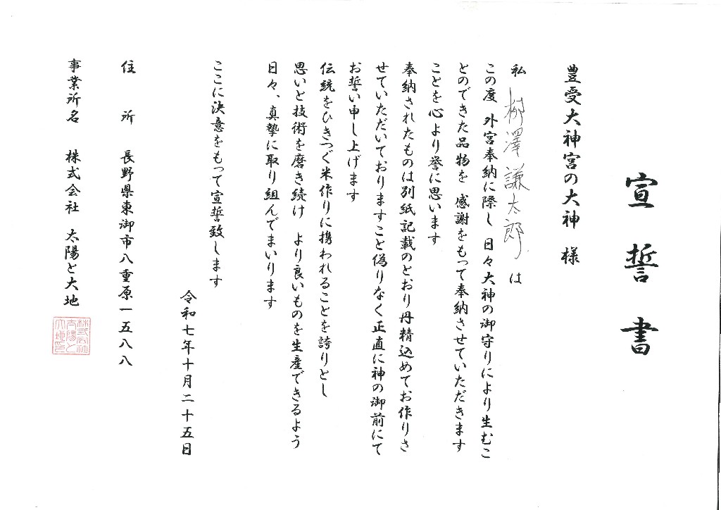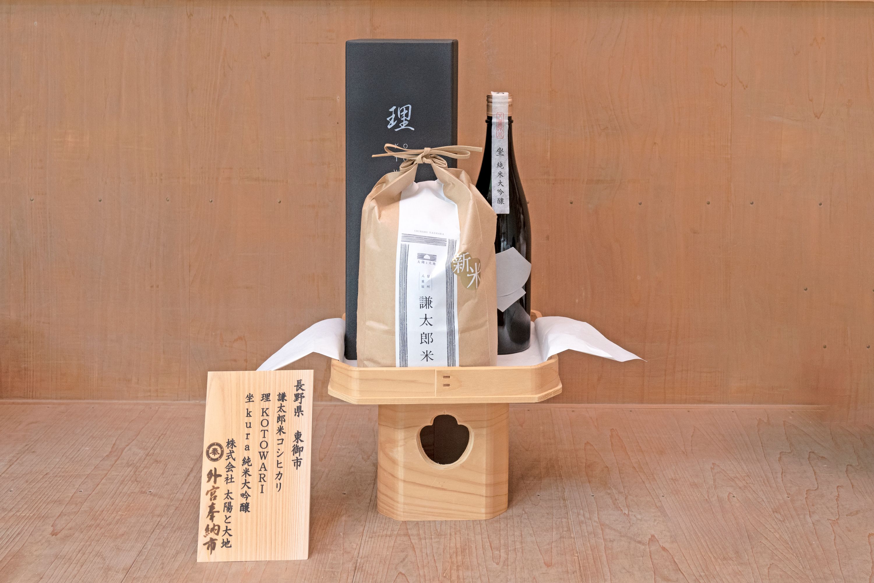 私たち株式会社太陽と大地は、信州・東御市八重原で350年以上続く稲作を受け継ぐ農業法人です。自社栽培「謙太郎米コシヒカリ」は、標高600~800mの台地で、蓼科山の湧水、肥沃な土壌、昼夜の寒暖差により育まれ、豊かな旨味と安心を兼ね備えた希少米として高い評価を頂いております。また、直営店「坐kura」では、自社栽培米から醸される日本酒を通じて地域の食文化を発信しております。なかでも「理 -KOTOWARI-」は、刀匠・宮入法廣、米農家・柳澤謙太郎、蔵元・田中隆一が八重原の大地で共鳴し誕生した銘酒で、日本のものづくり精神を体現する品格ある一杯です。